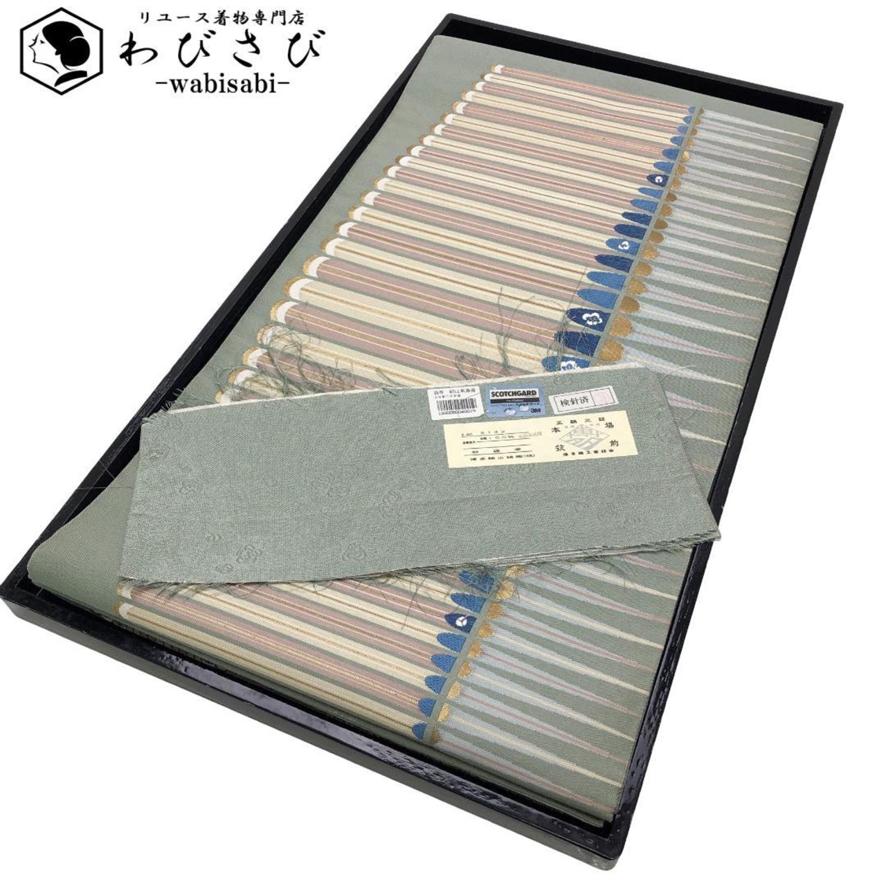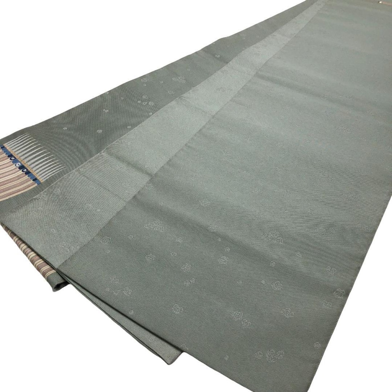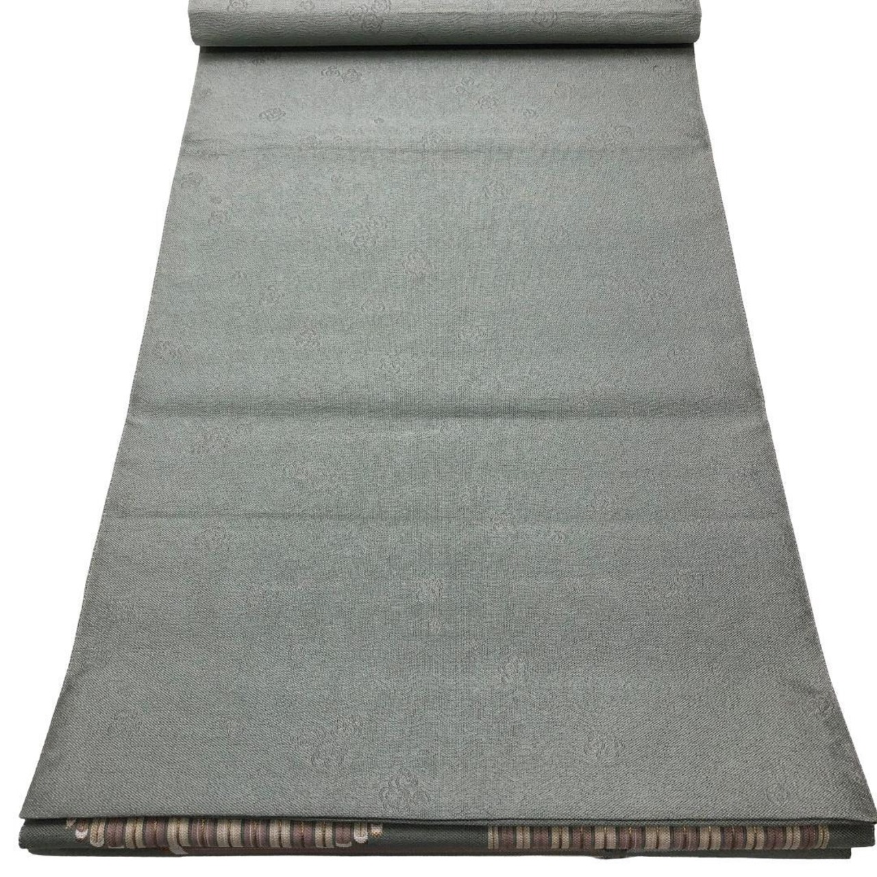 利休鼠色の上品なお色味に美しい織模様がデザインされた素敵な柄裄のお品でございます。