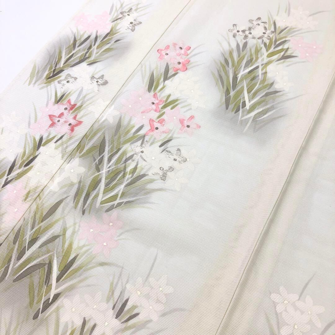 薄利休白茶色の上品なお色味に手描きの花模様の柄裄がデザインされた透け感のある素敵なお品でございます。