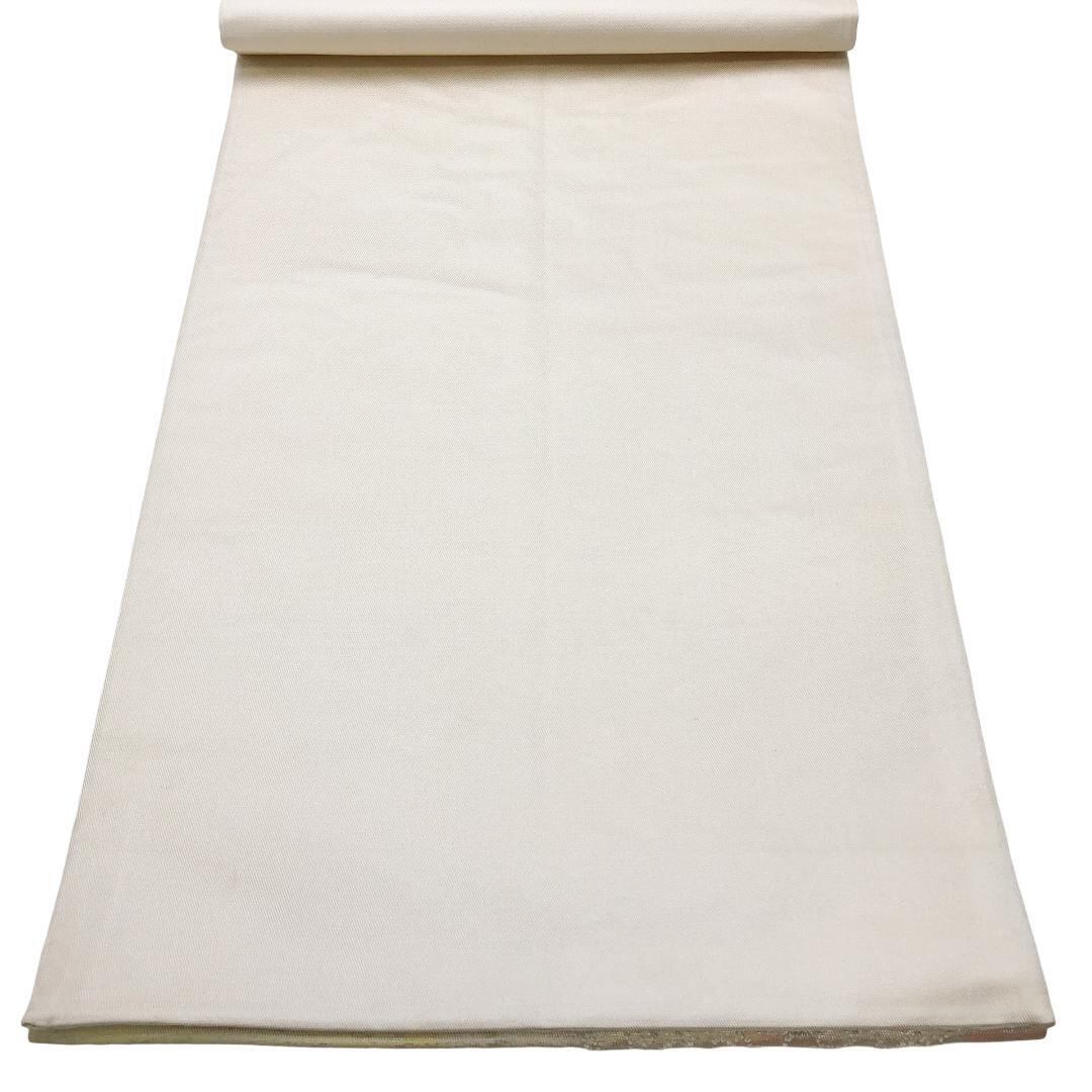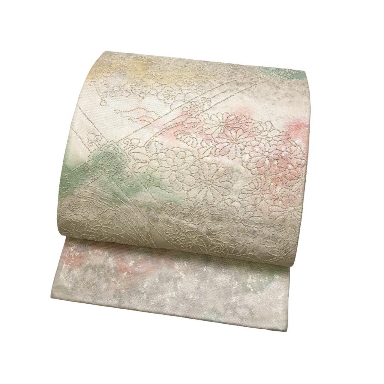 乳白色の上品なお色味に引き箔、赤、緑、黄色の鮮やかな暈し模様に相良刺繍の花柄模様がデザインされた素敵なお品でございます。