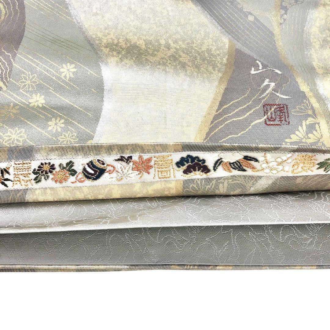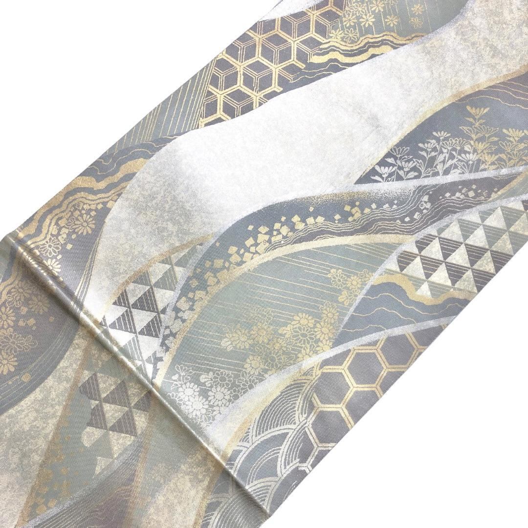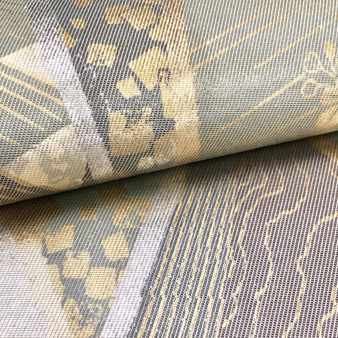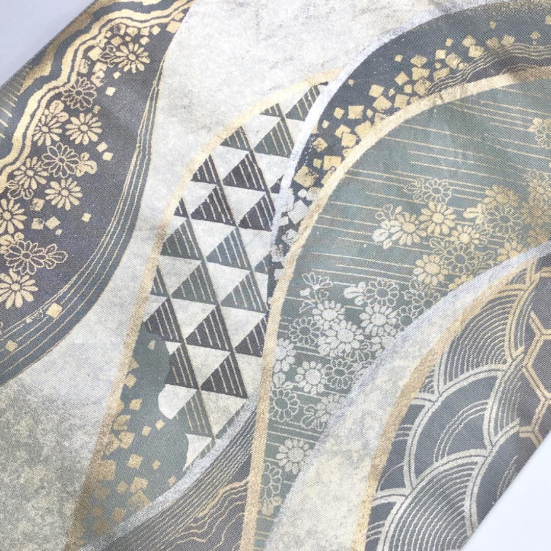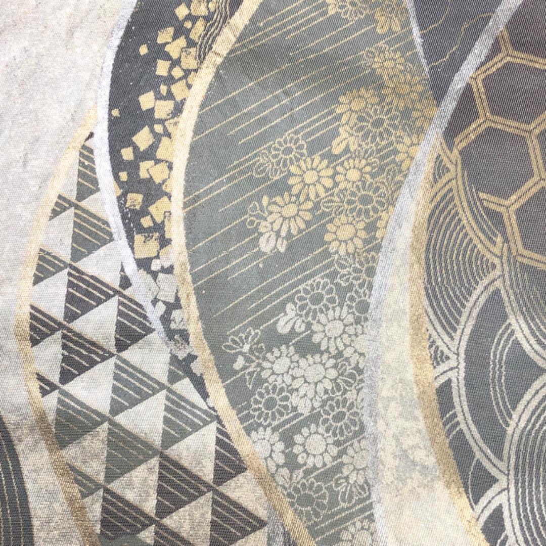牙黄色のお色味に曲線に多様な花柄模様、亀甲、青海波などの柄行がデザインされた素敵なお品でございます。