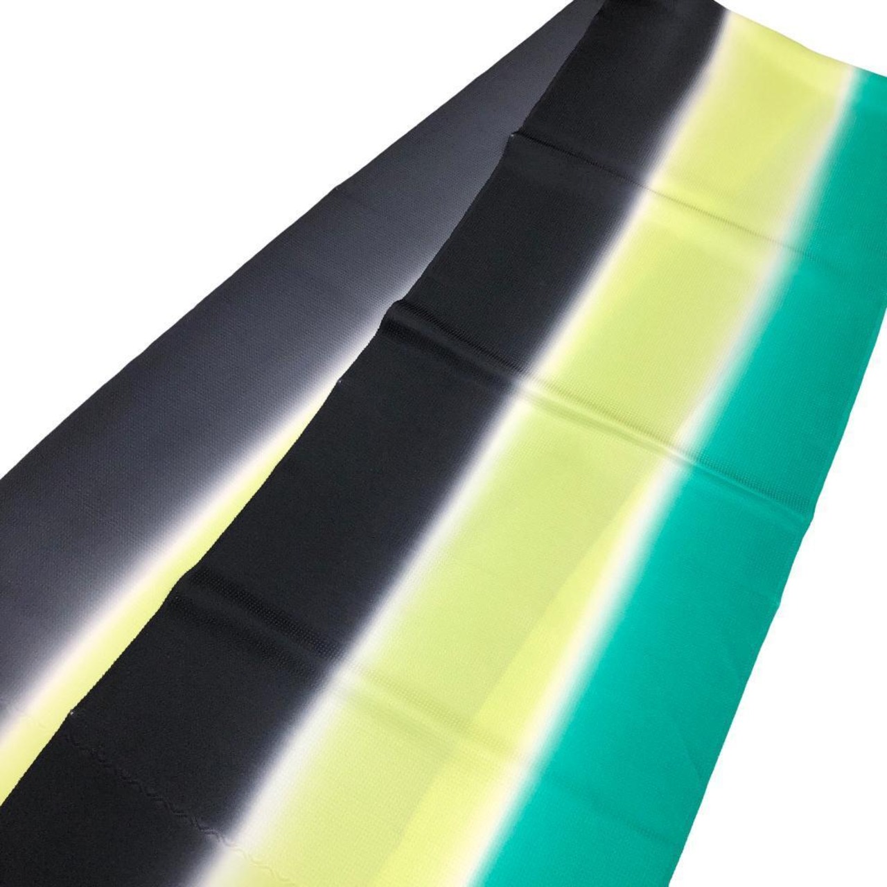 3色の染め分けのお色味に縦縞模様の柄裄がデザインされた素敵なお品でございます。