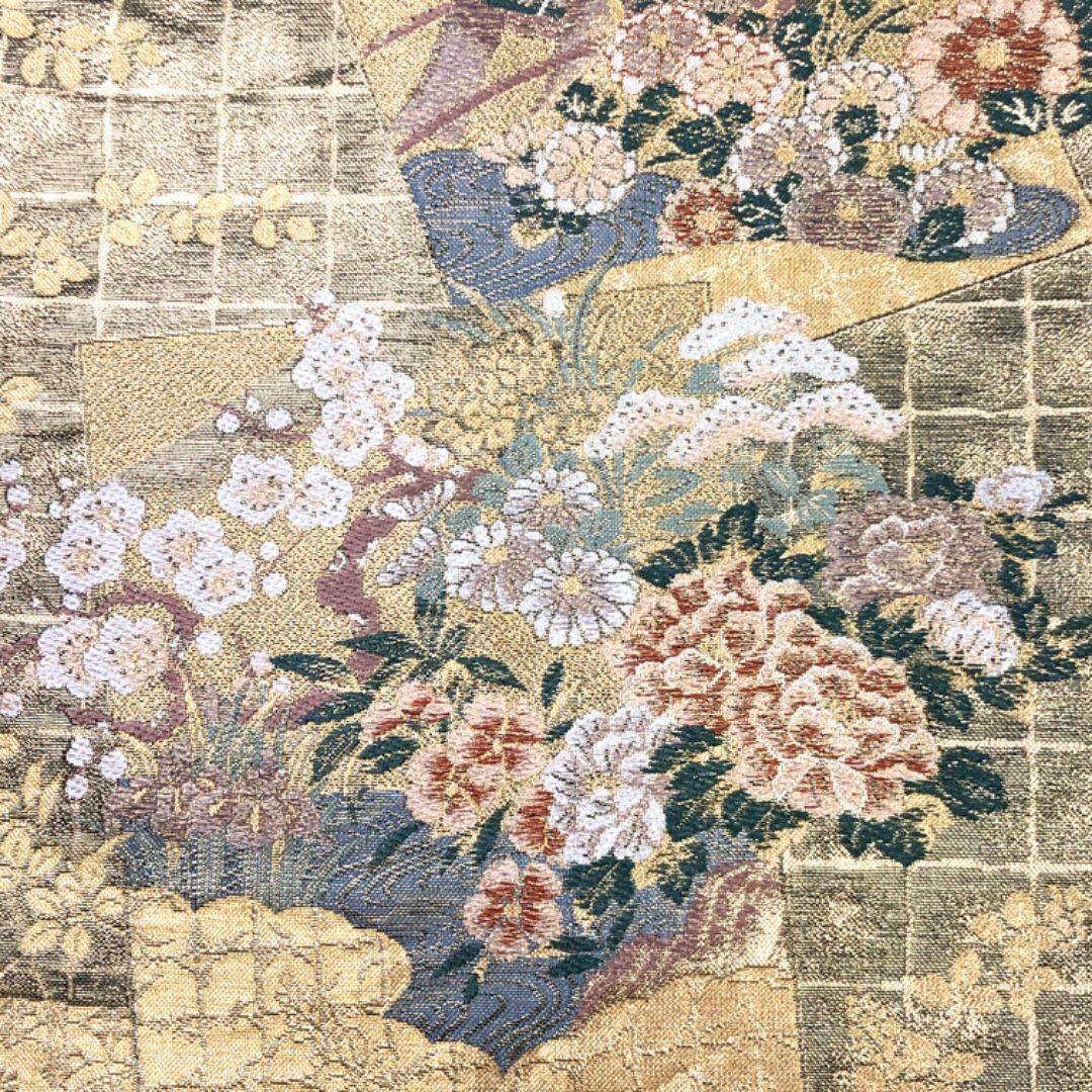 金色ベースのお色味に色紙に御所車、美しい花柄模様、流水がデザインされた素敵な柄裄のお品でございます。