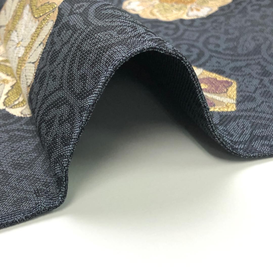 藍錆色の落ち着いたお色味、紋紗の透け感のある多彩な華柄模様がデザインされた透け感のある紋紗のスリーシーズンお使い頂ける素敵なお品でございます。