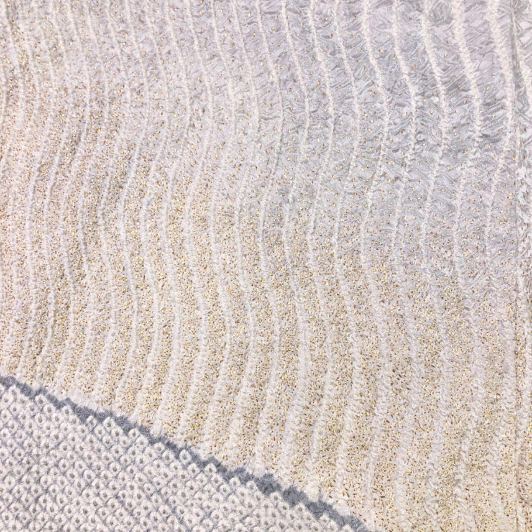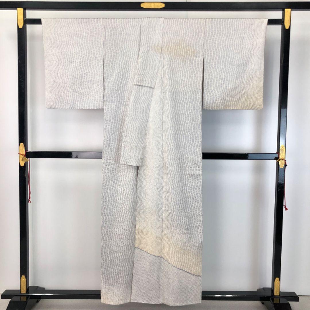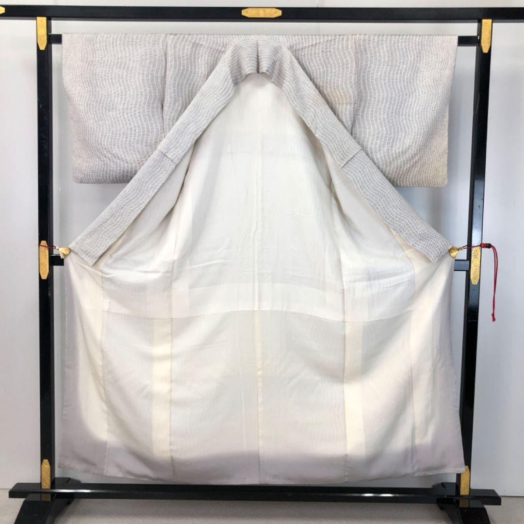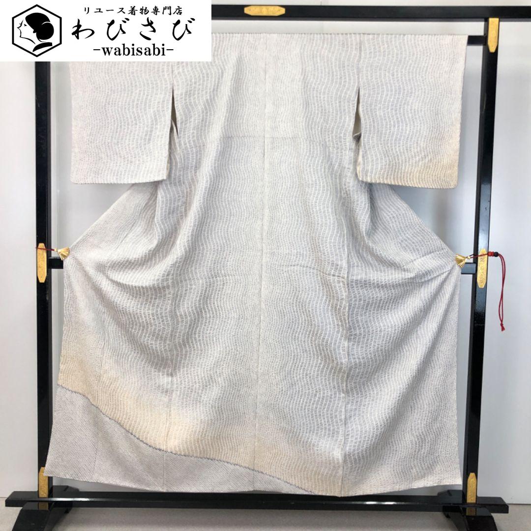 雲井鼠色ベースの上品なお色味に暈し、縦縞曲線模様の柄裄がデザインされた素敵なお品でございます。