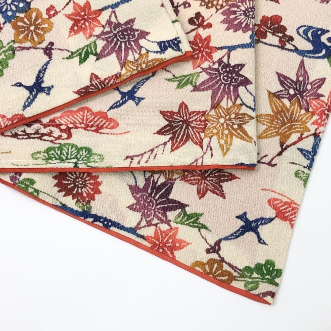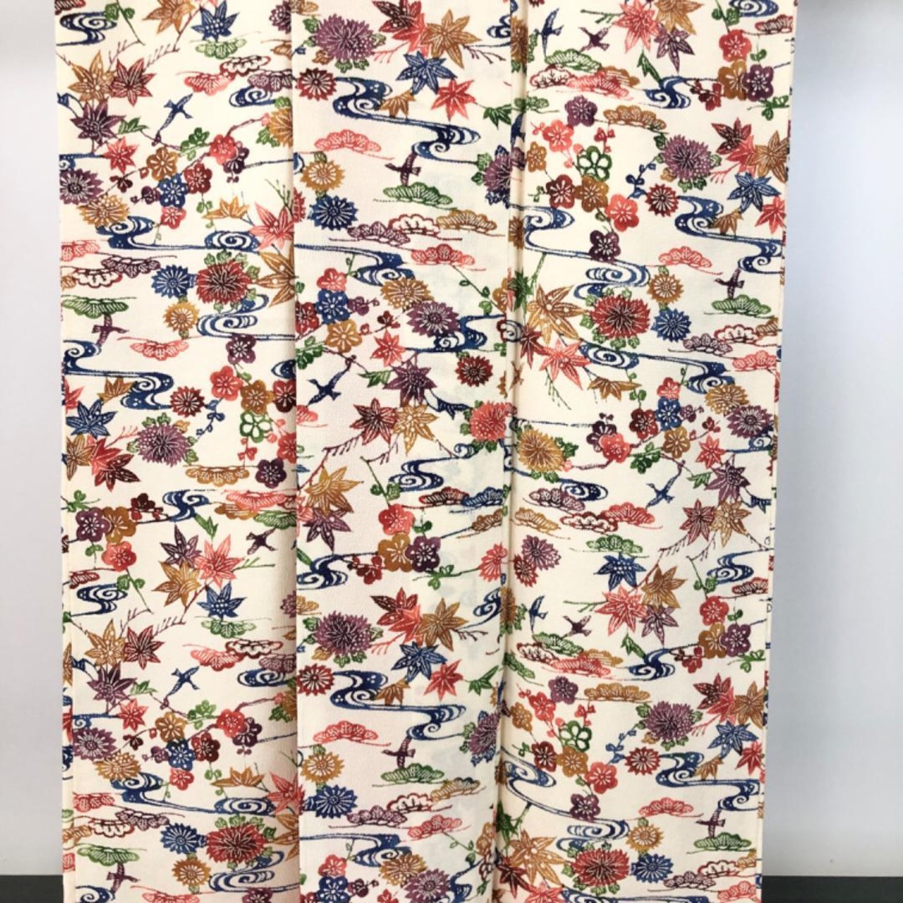 鳥の子色の品のあるお色味の縮緬に型染の流水に花模様、鳥、楓などの柄裄がデザインされた彩りの鮮やかな素敵なお品でございます。