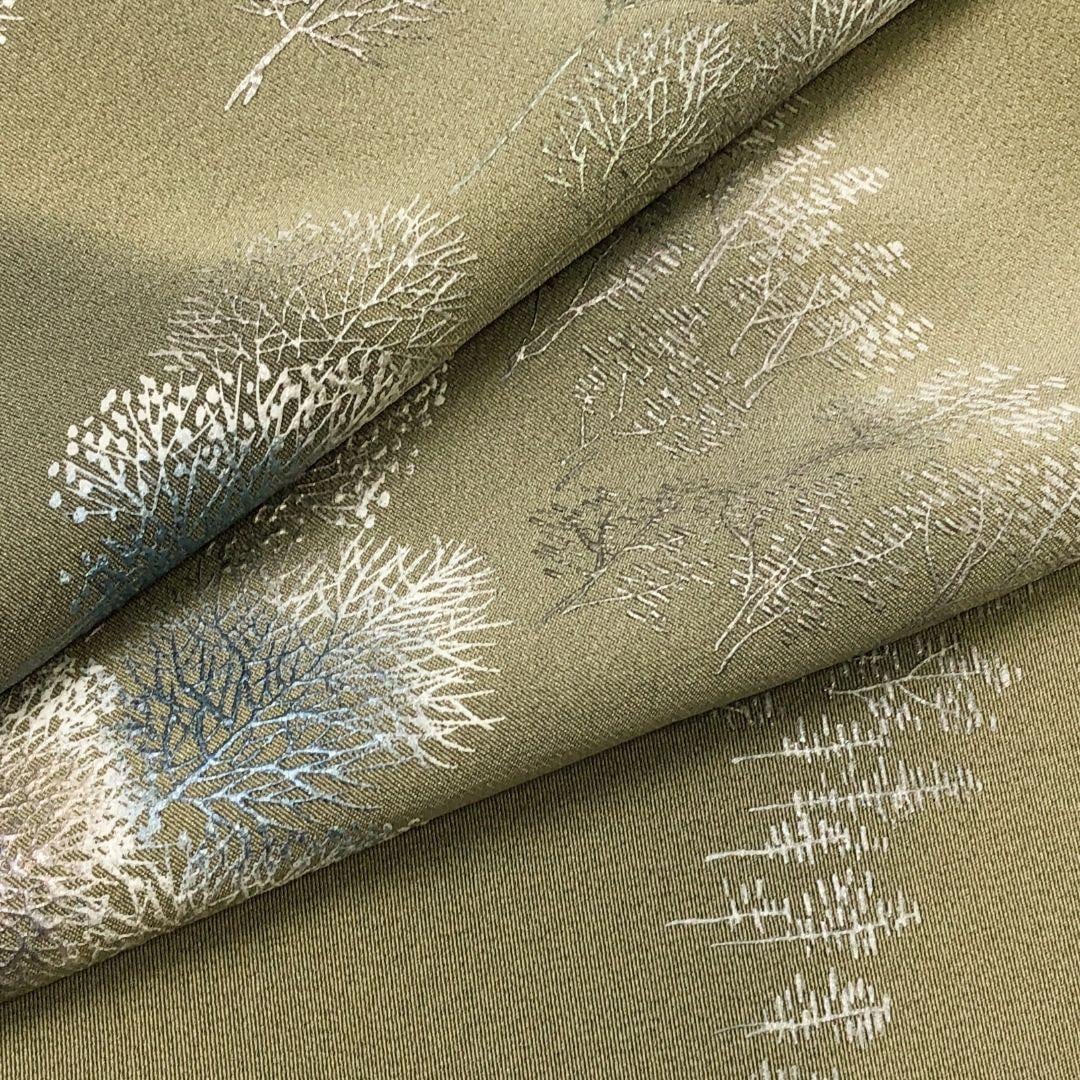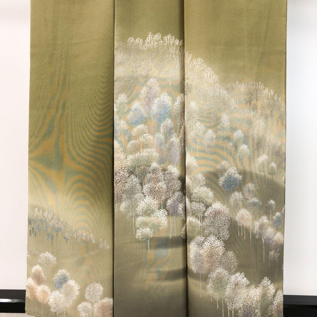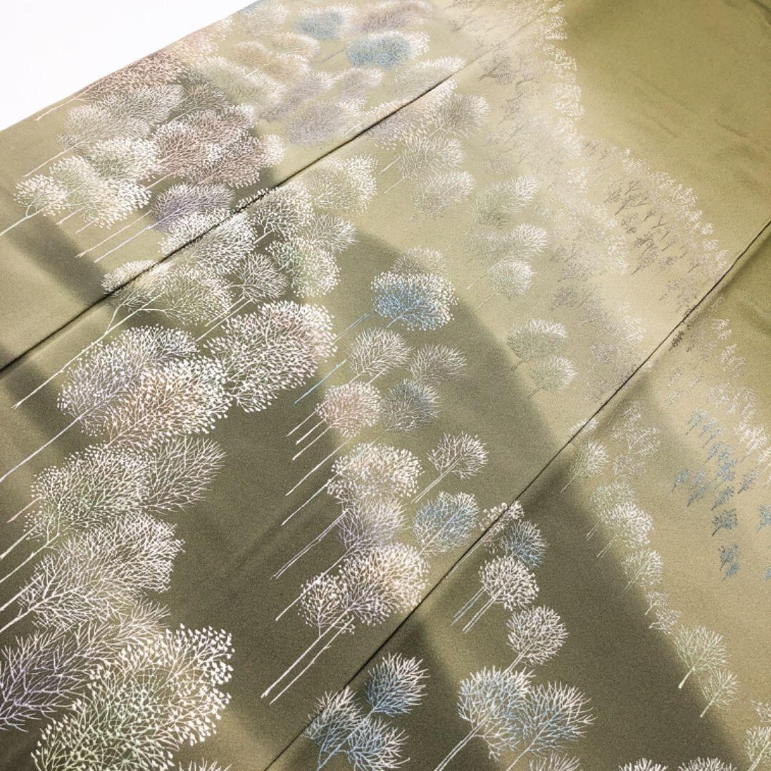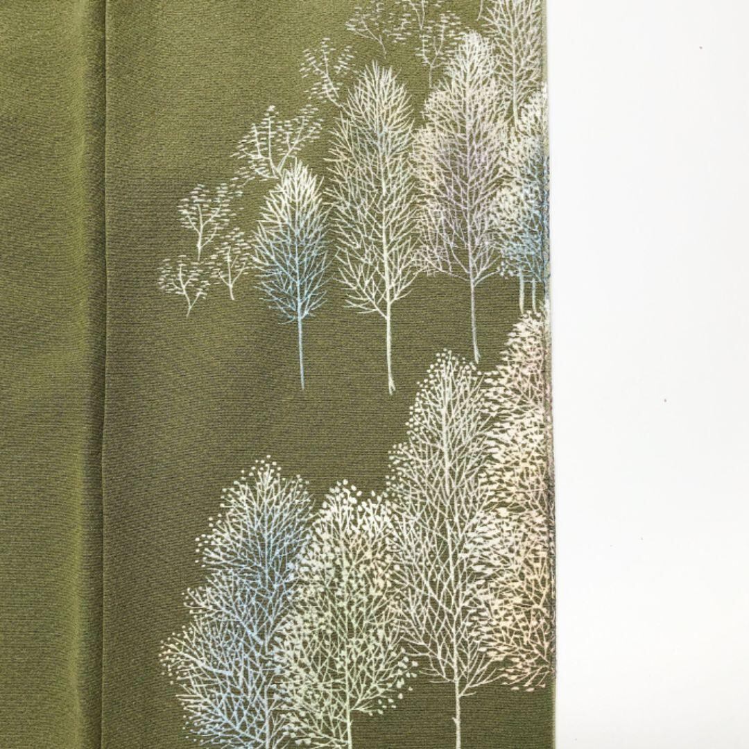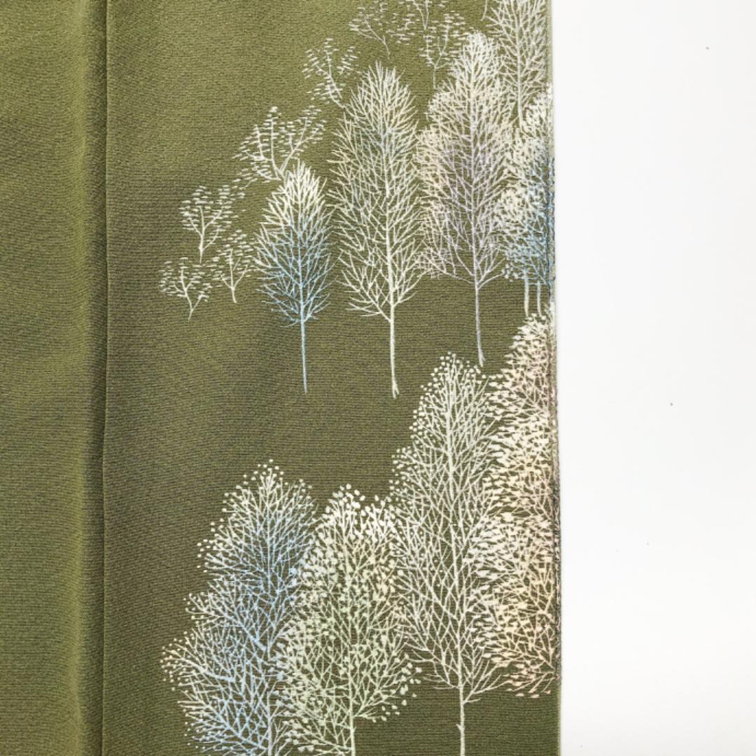 柳色のお色味に美しい木々模様の柄裄がデザインされた素敵なお品でございます。