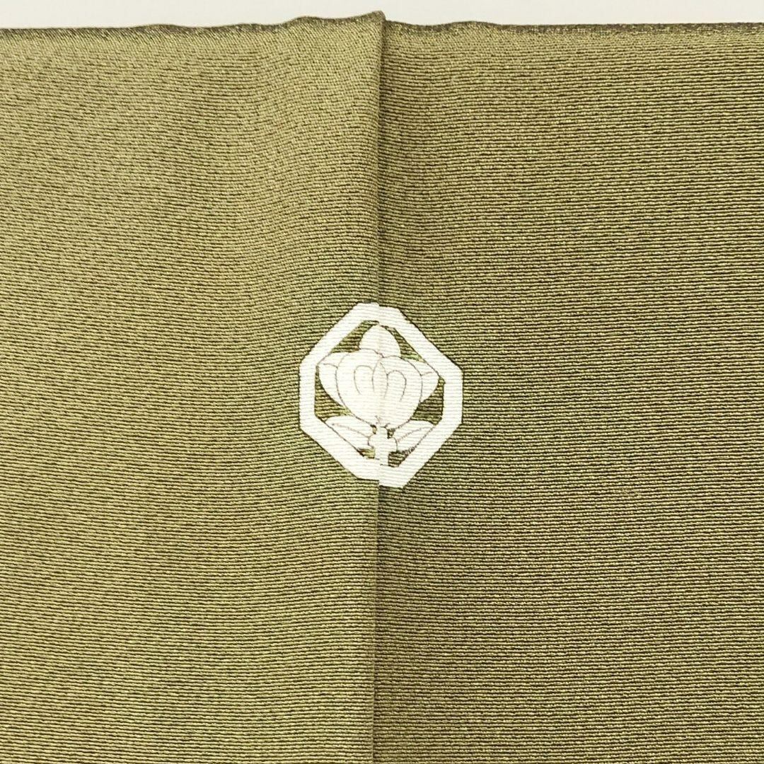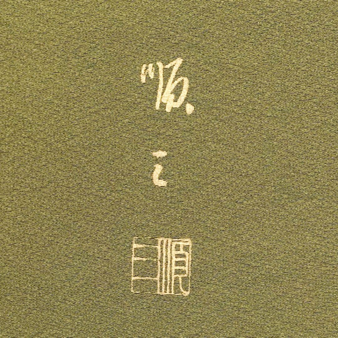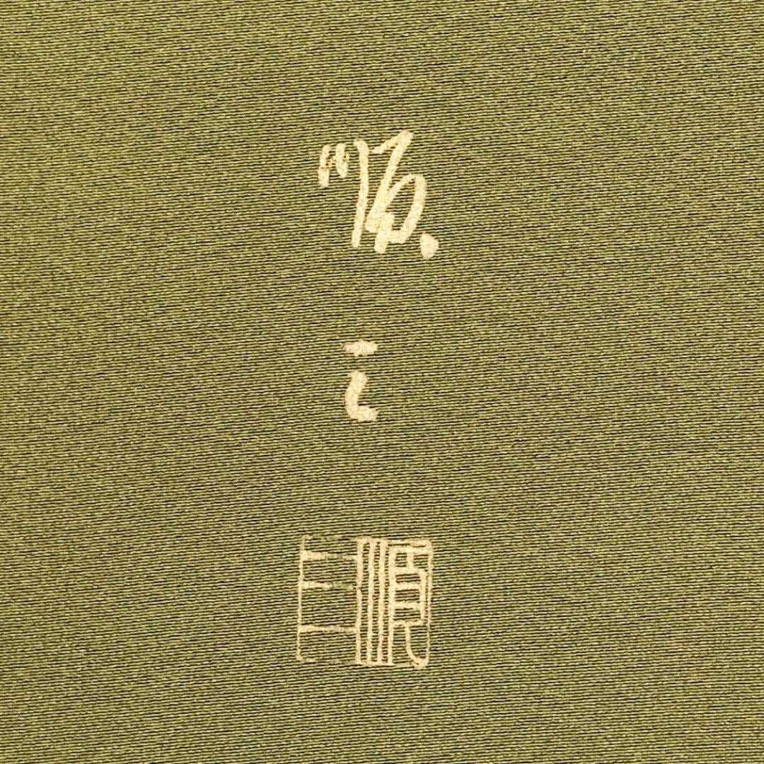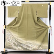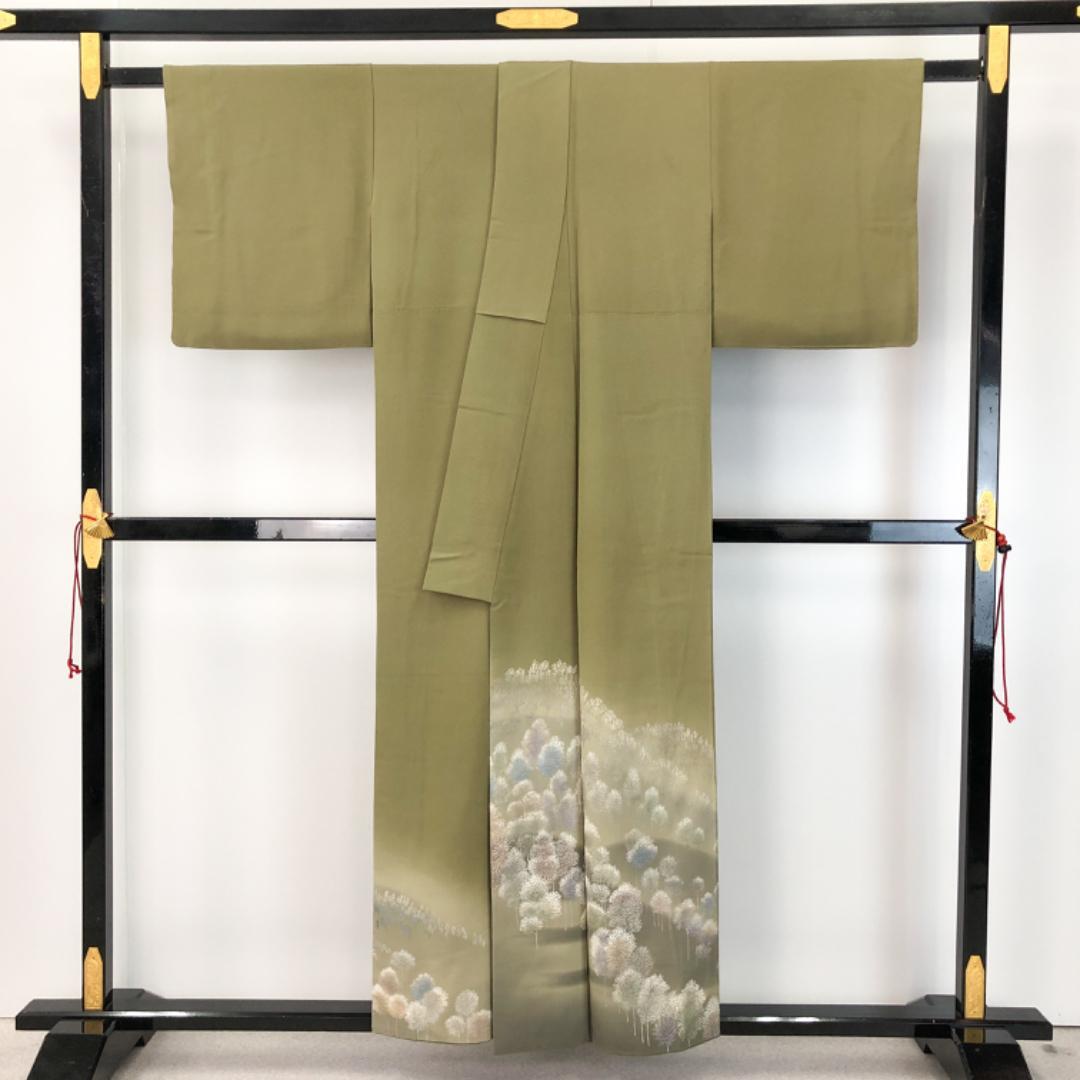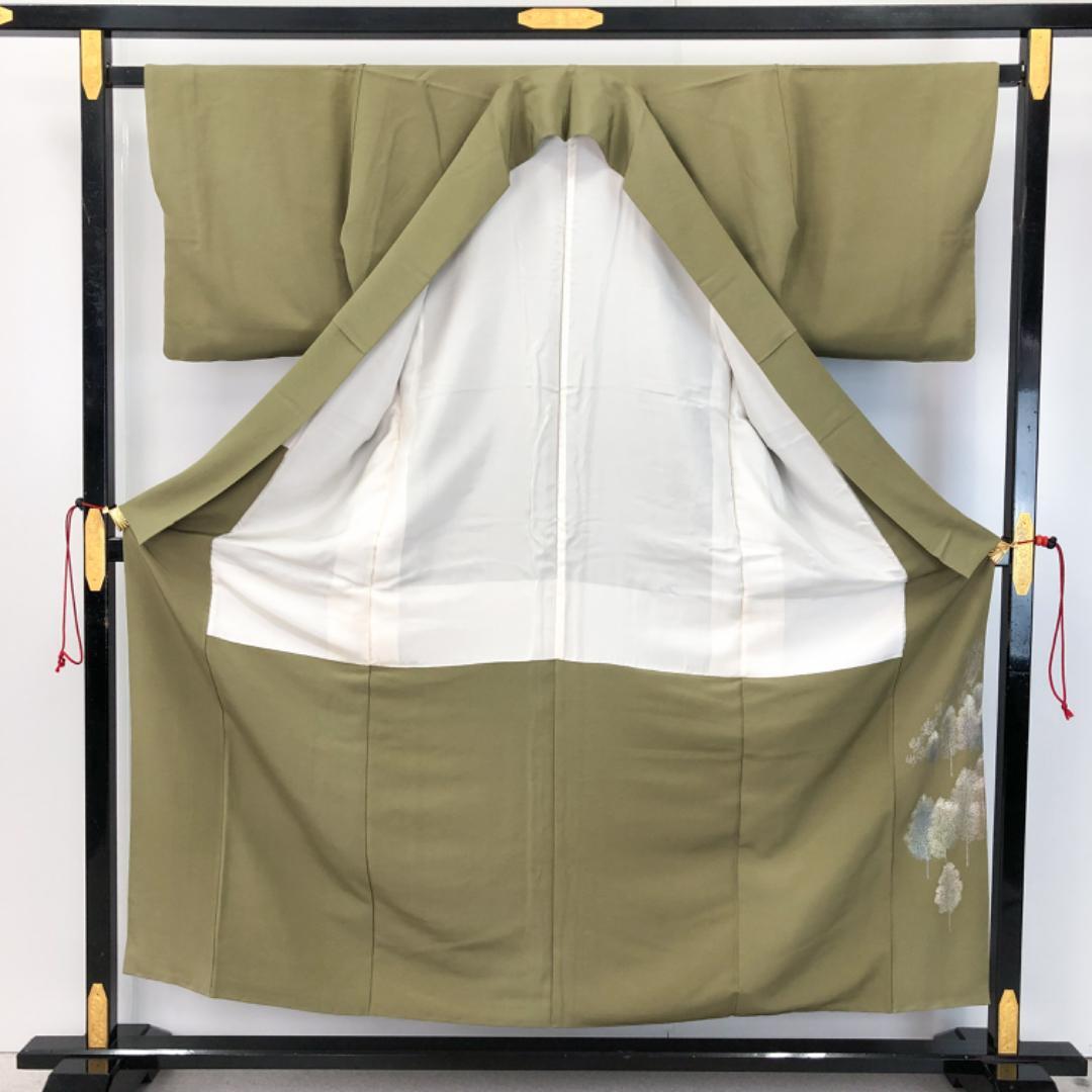 柳色のお色味に美しい木々模様の柄裄がデザインされた素敵なお品でございます。