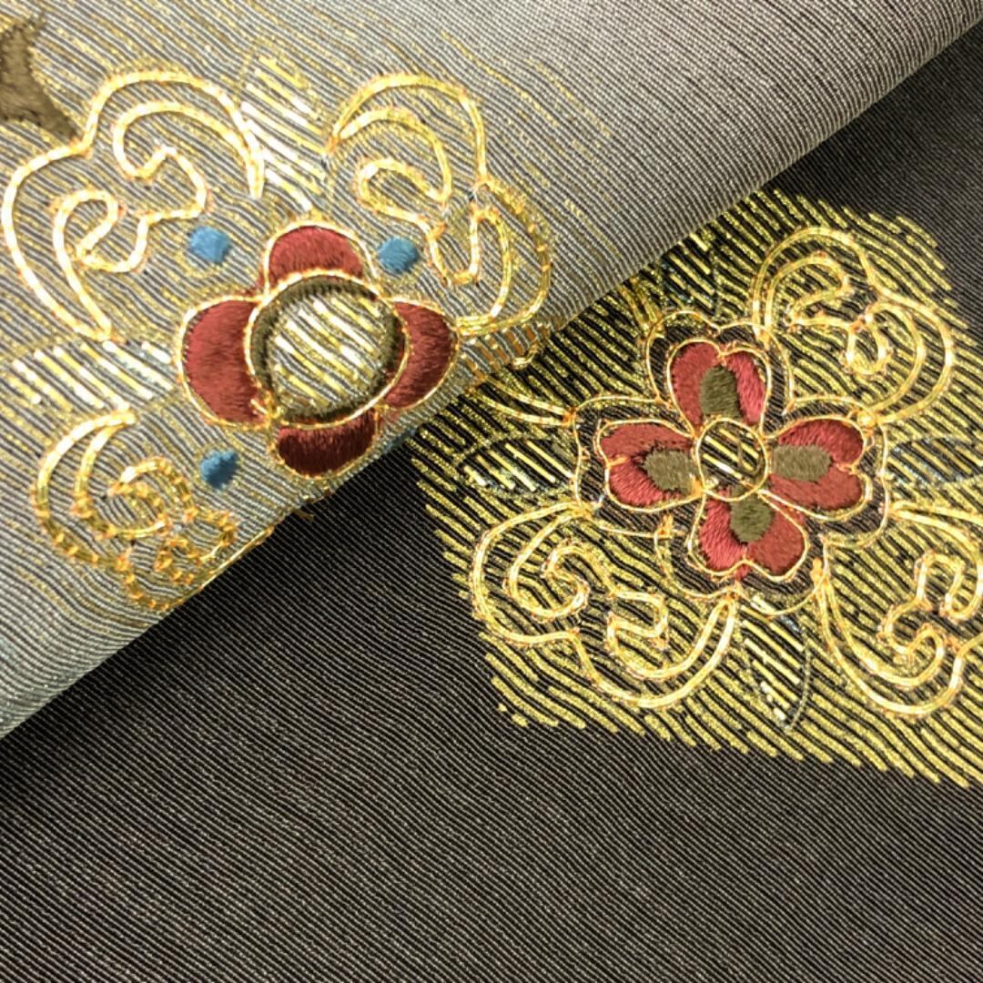 栗鼠色の落ち着いたお色味に暈し、刺繍、金駒などが使われた菱形に華柄模様の柄裄がデザインされた素敵なお品でございます。