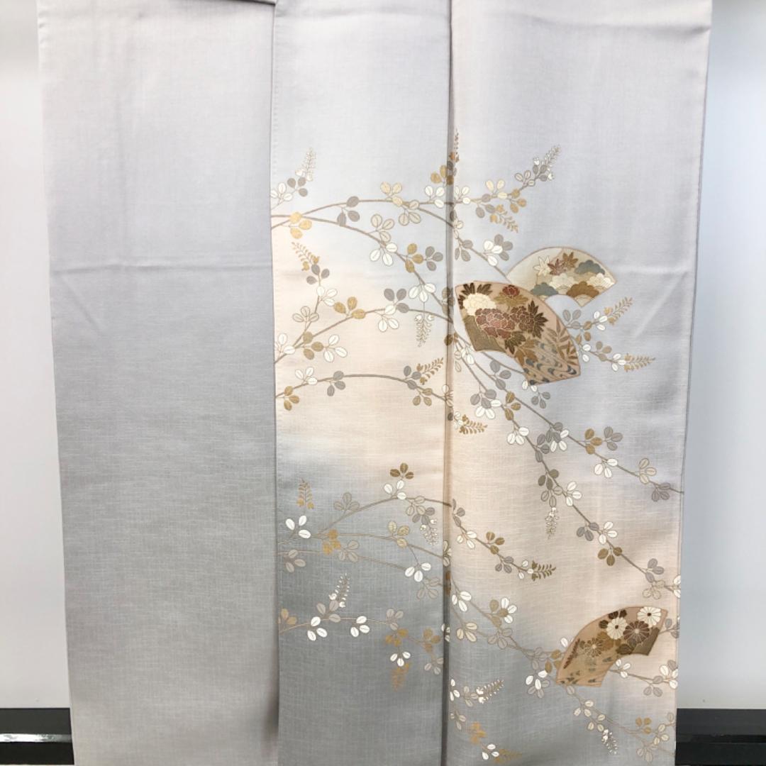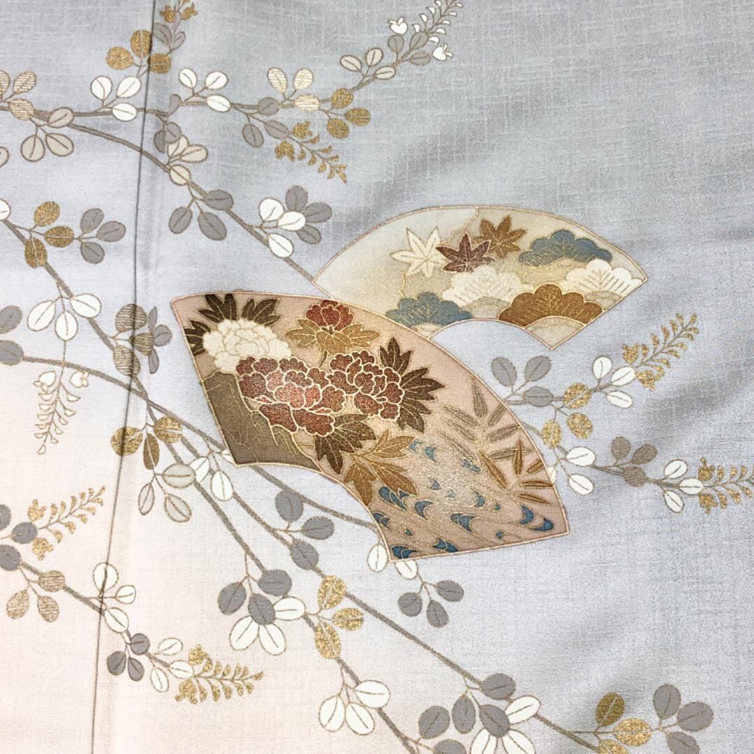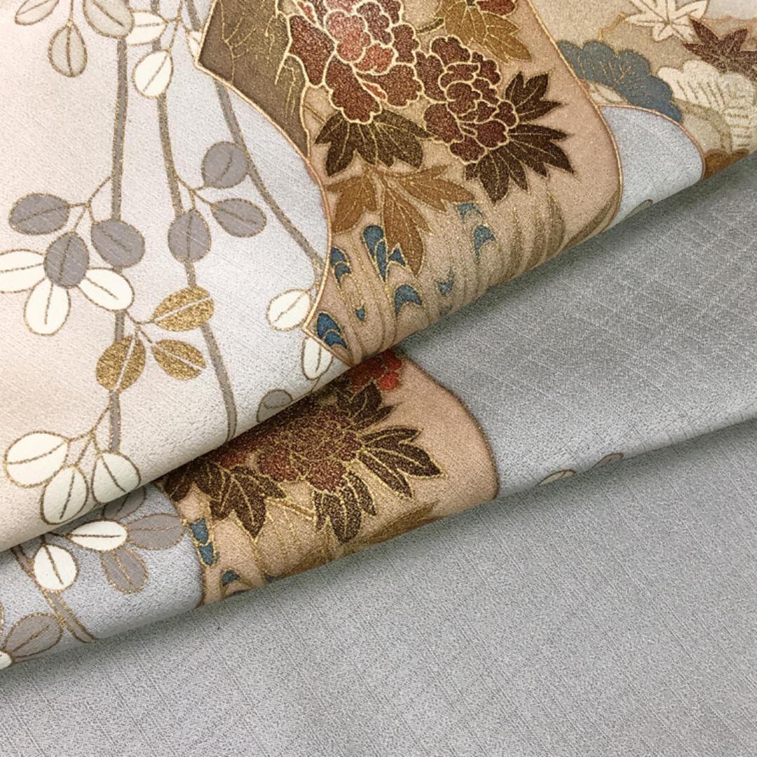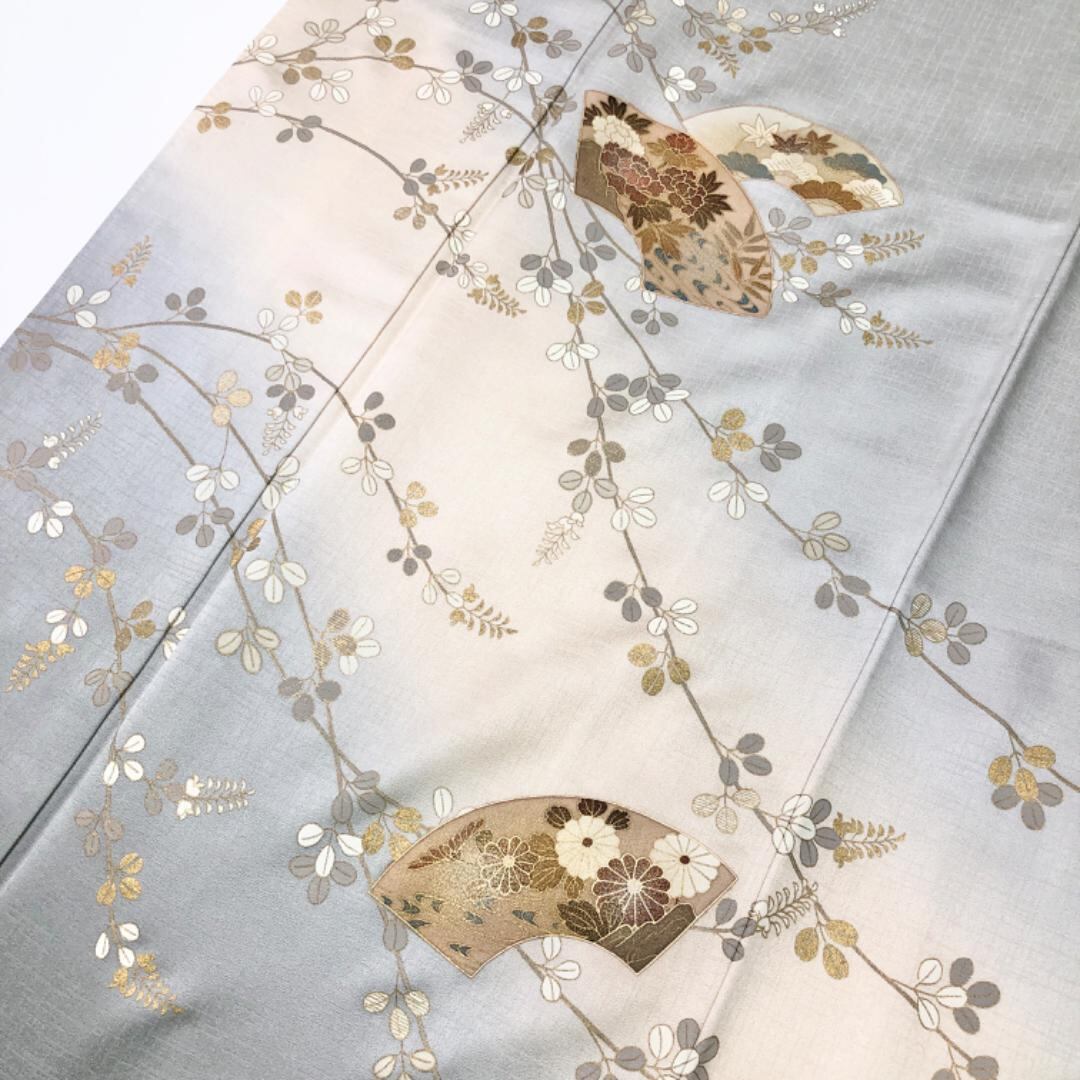 白鼠色の上品なお色味、地紙に花模様、萩の花の柄裄がデザインされた品のある素敵なお品でございます。