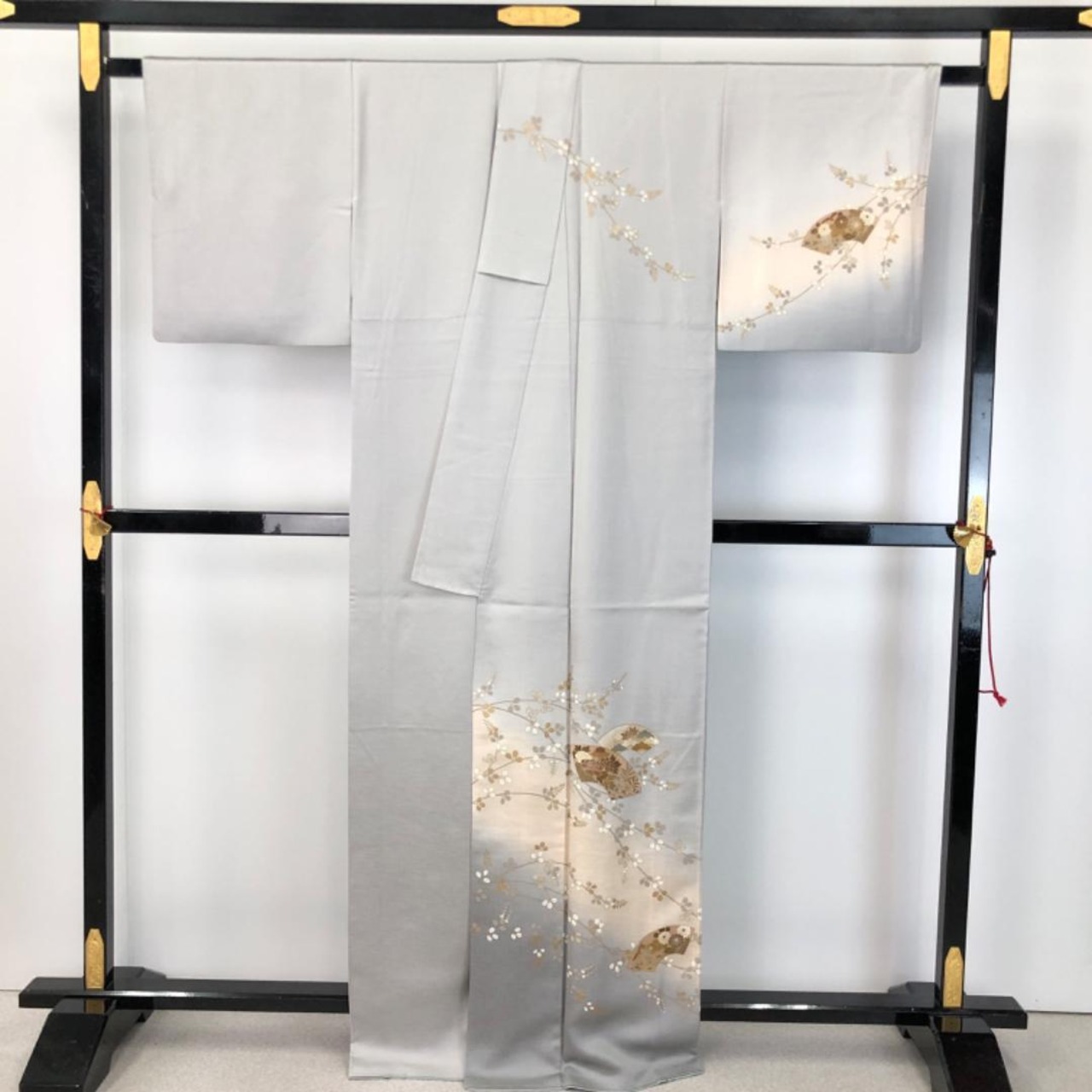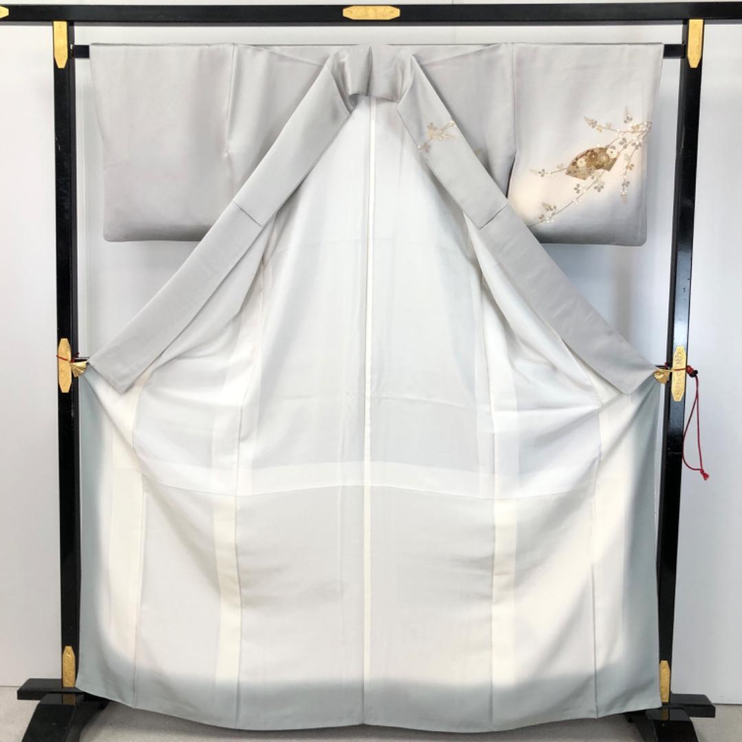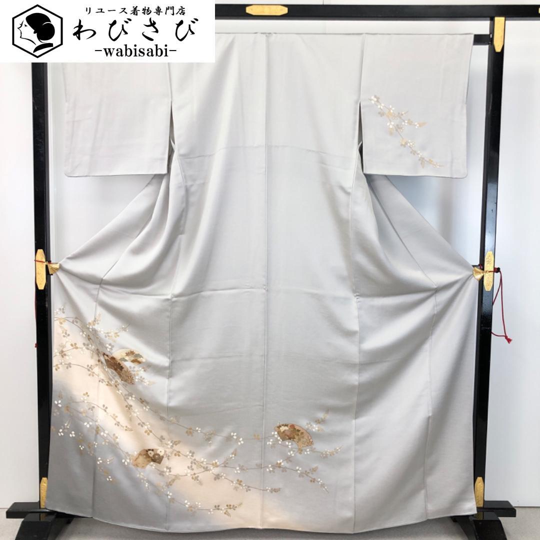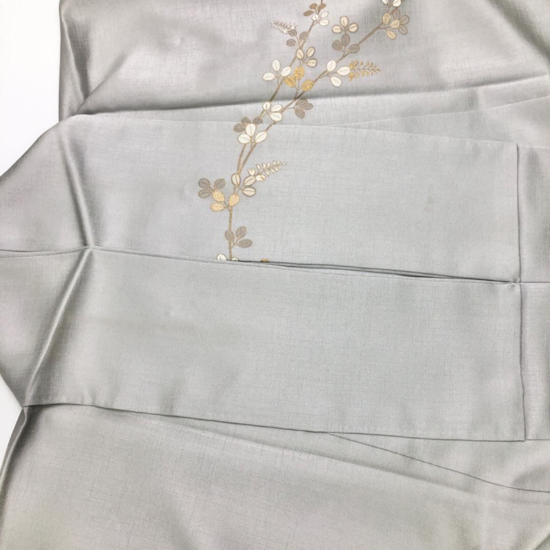 白鼠色の上品なお色味、地紙に花模様、萩の花の柄裄がデザインされた品のある素敵なお品でございます。