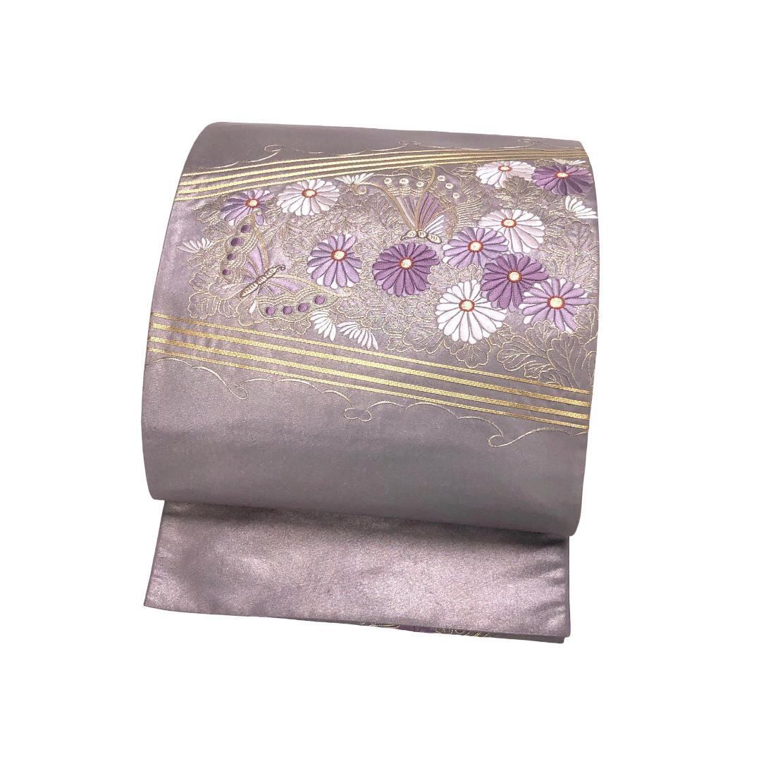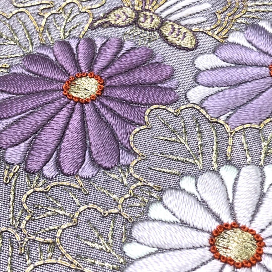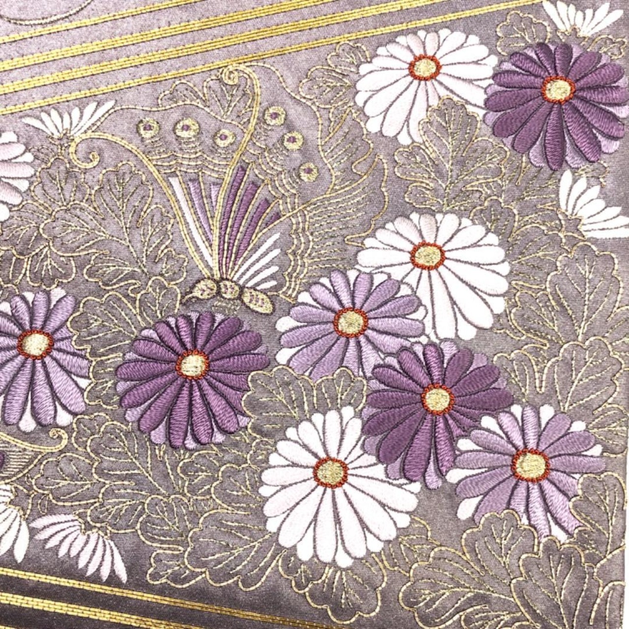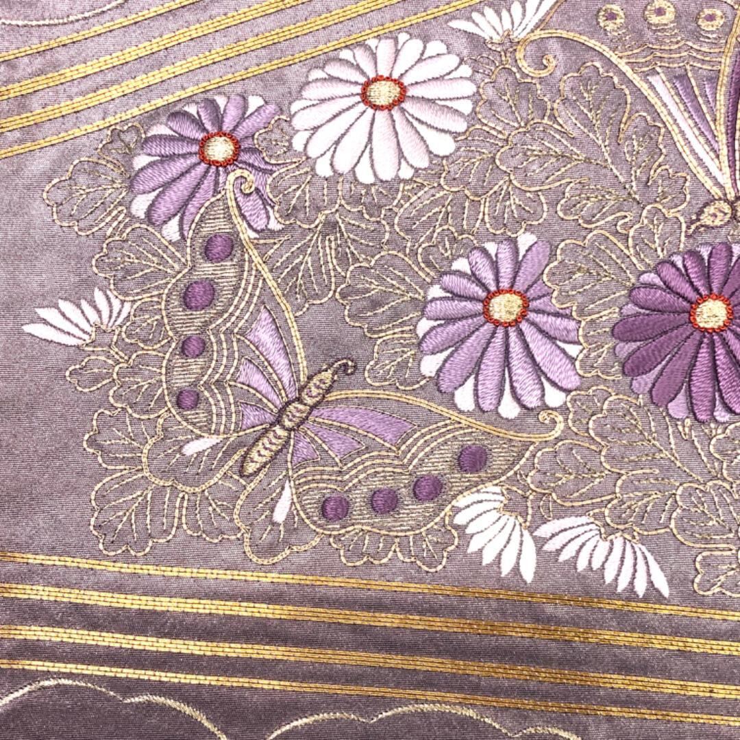 桜鼠色の品のあるお色味に淡い紫色で総刺繍柄の菊の花模様、蝶々の柄行がデザインされた素敵なお品でございます。