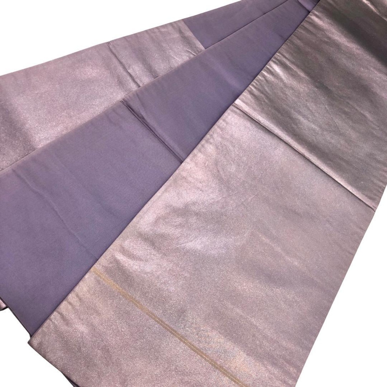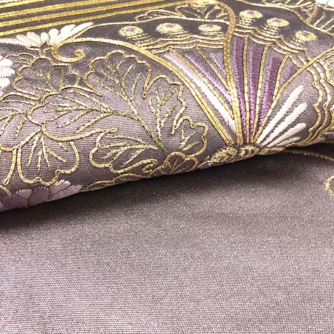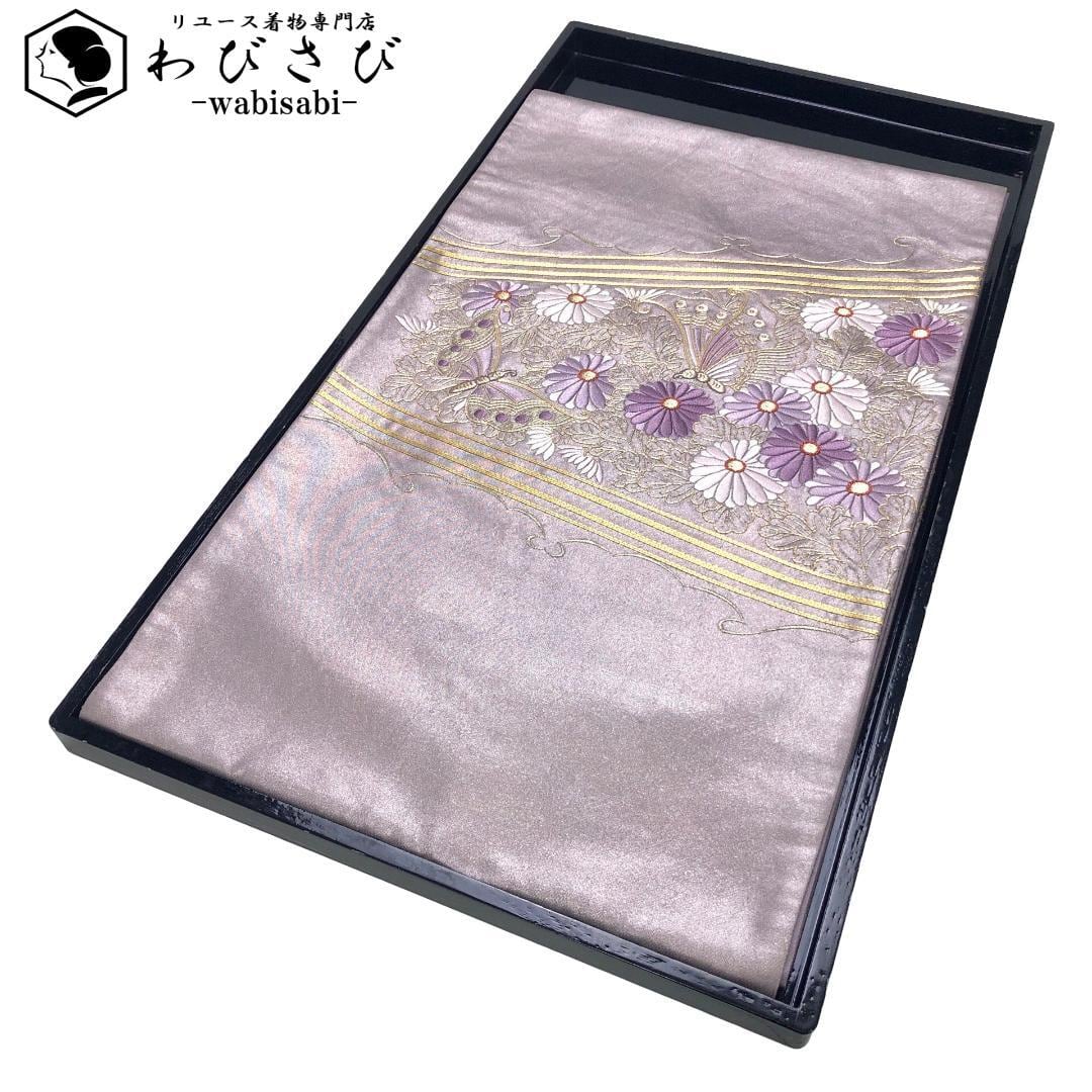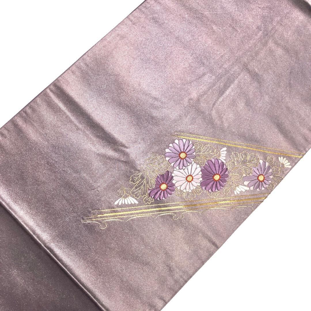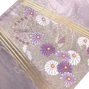 桜鼠色の品のあるお色味に淡い紫色で総刺繍柄の菊の花模様、蝶々の柄行がデザインされた素敵なお品でございます。