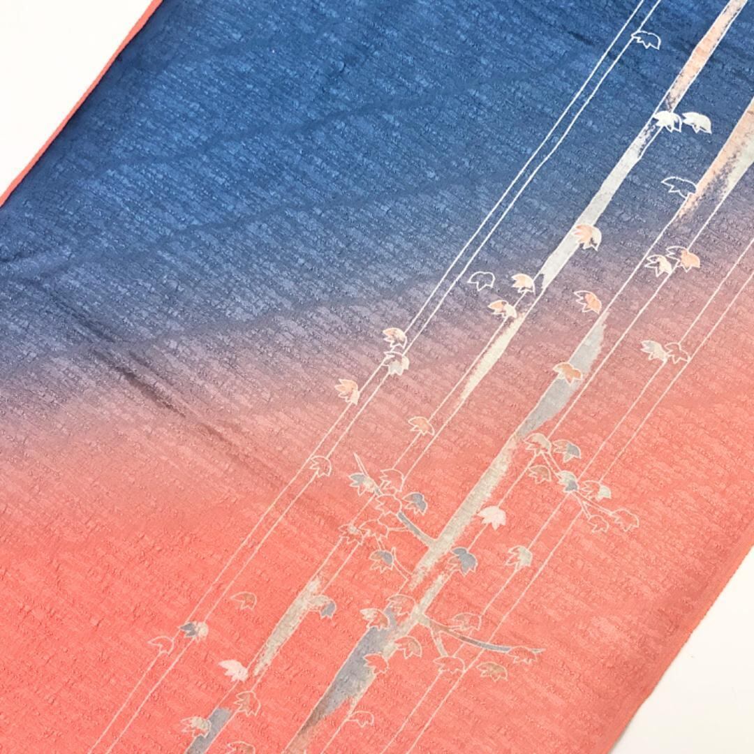 薄紅色と藍御納戸色の2色のお色味に草木模様の柄裄がデザインされた素敵なお品でございます。
