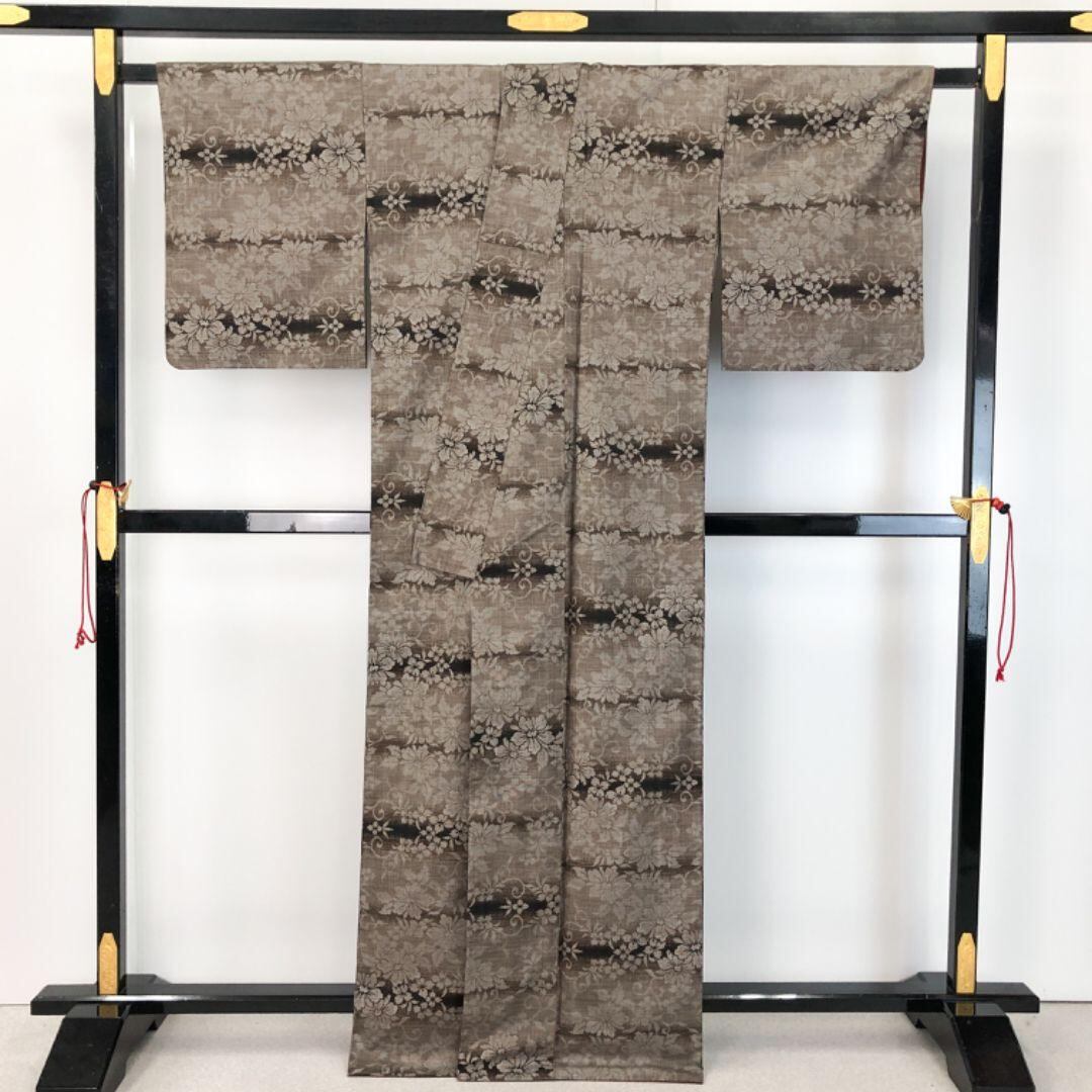 茶泥染の雰囲気の良いお色味に花唐草模様がデザインされた素敵な柄裄のお品でございます。