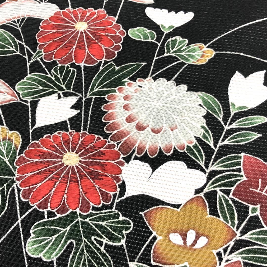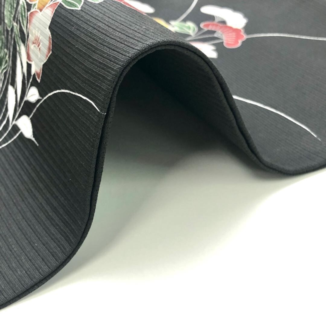 絽の透け感のある黒色のお色味に刺繍や金糸が使われた花柄模様がデザインされた素敵な柄裄のお品でございます。