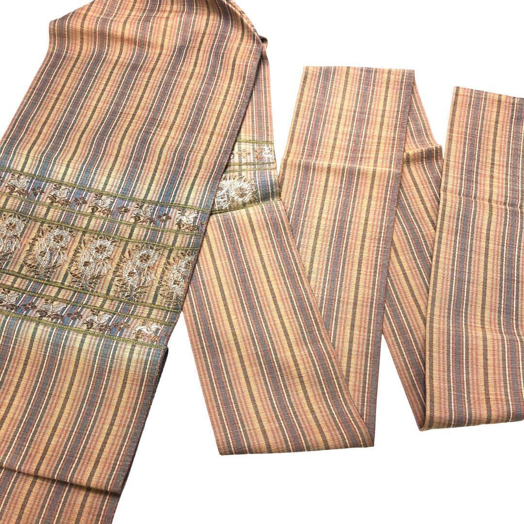 落ち着いた色彩の縦縞織模様に金銀糸が使われた横柄花模様がデザインされた素敵なお品でございます。