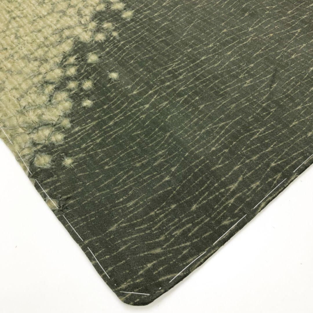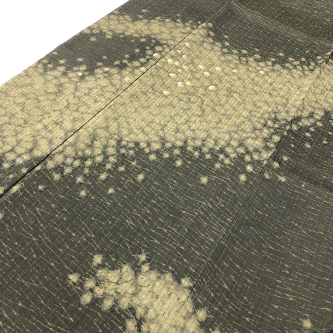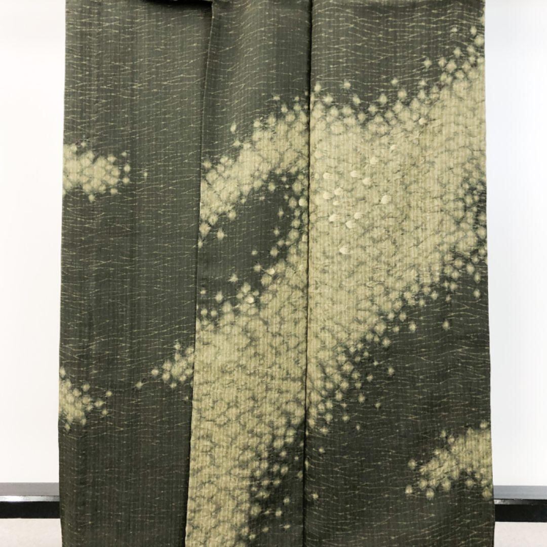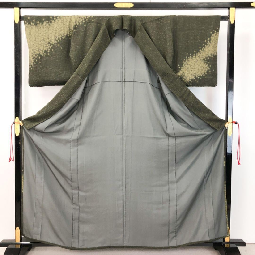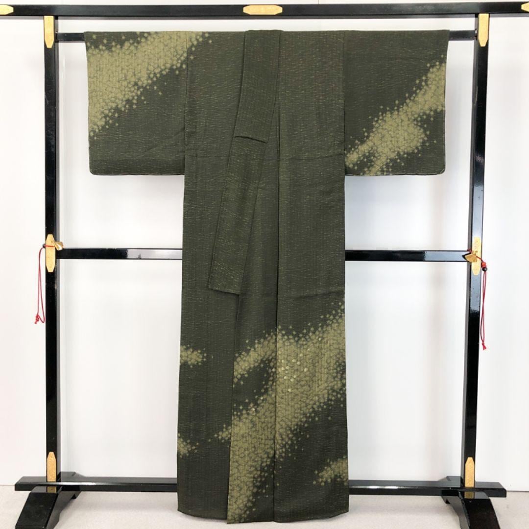 老緑色の落ち着きのあるお色味に雰囲気の良い絞り柄、一部刺繍の柄行がデザインされた素敵なお品でございます。