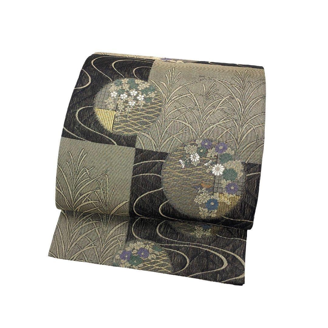 袋帯 縦すくい 格子柄 丸に花模様 流水 金糸 O-5009 着物 きもの kimono 和服 和装 中古 リサイクル着物 【送料無料】