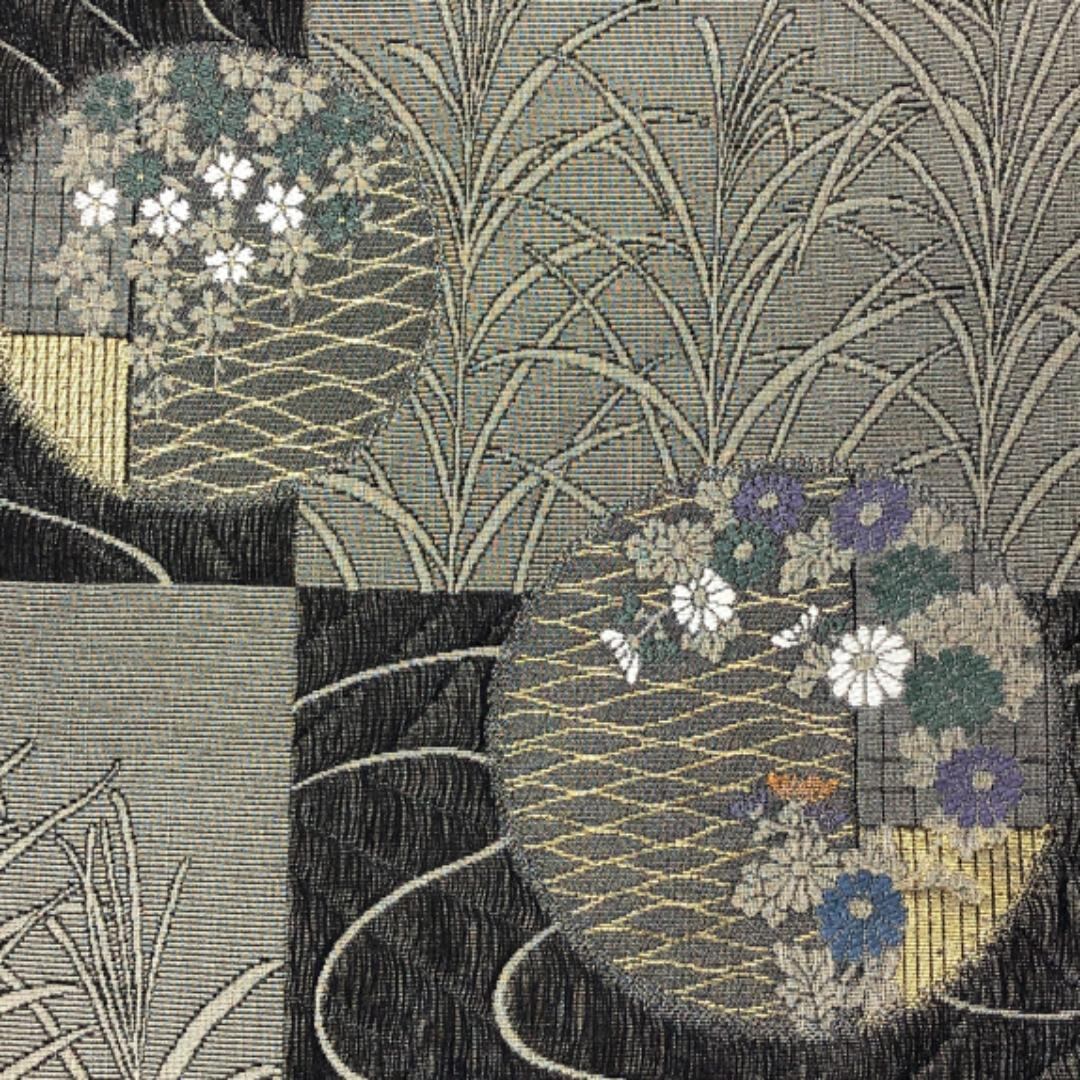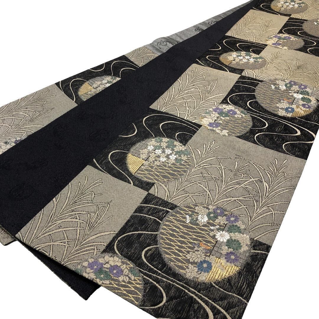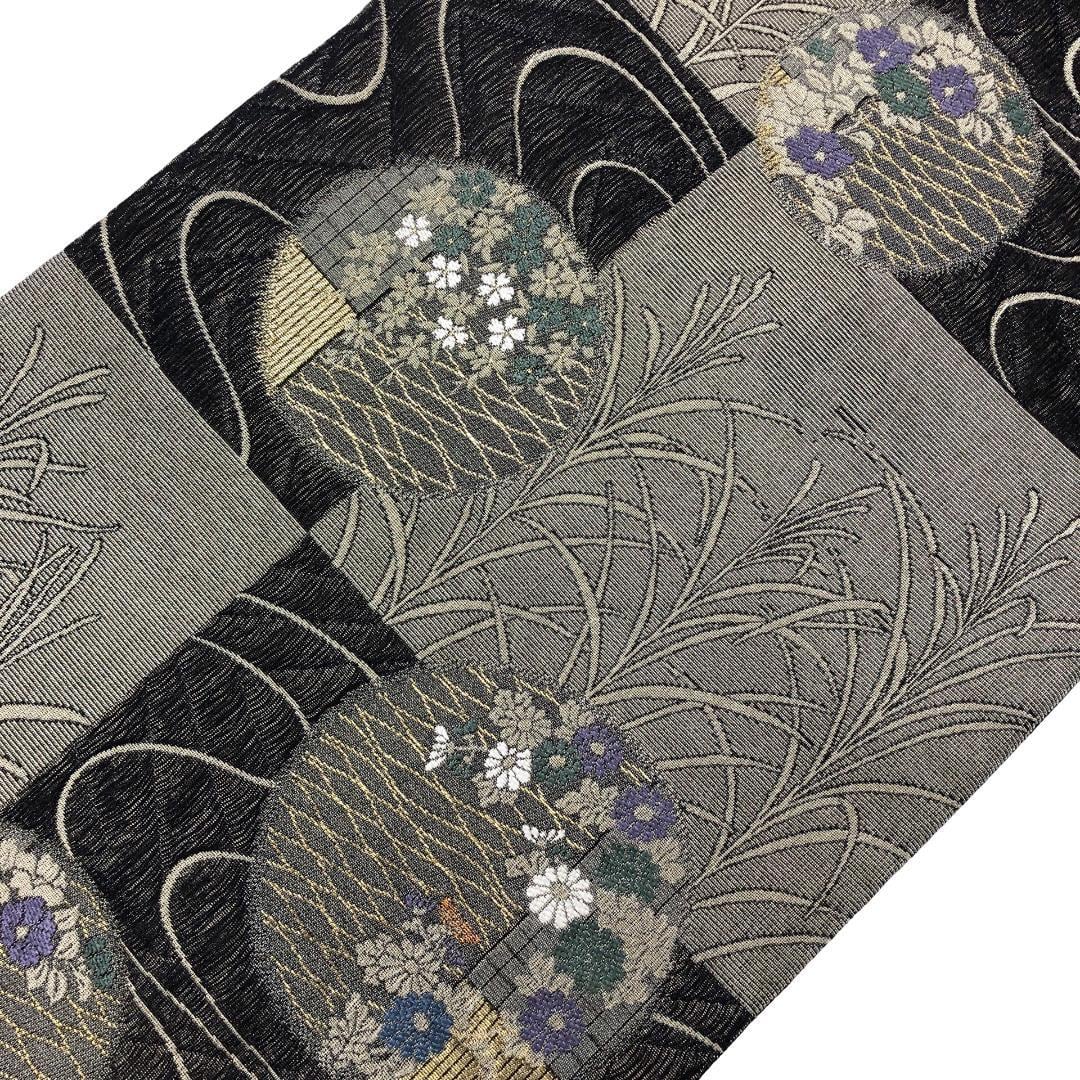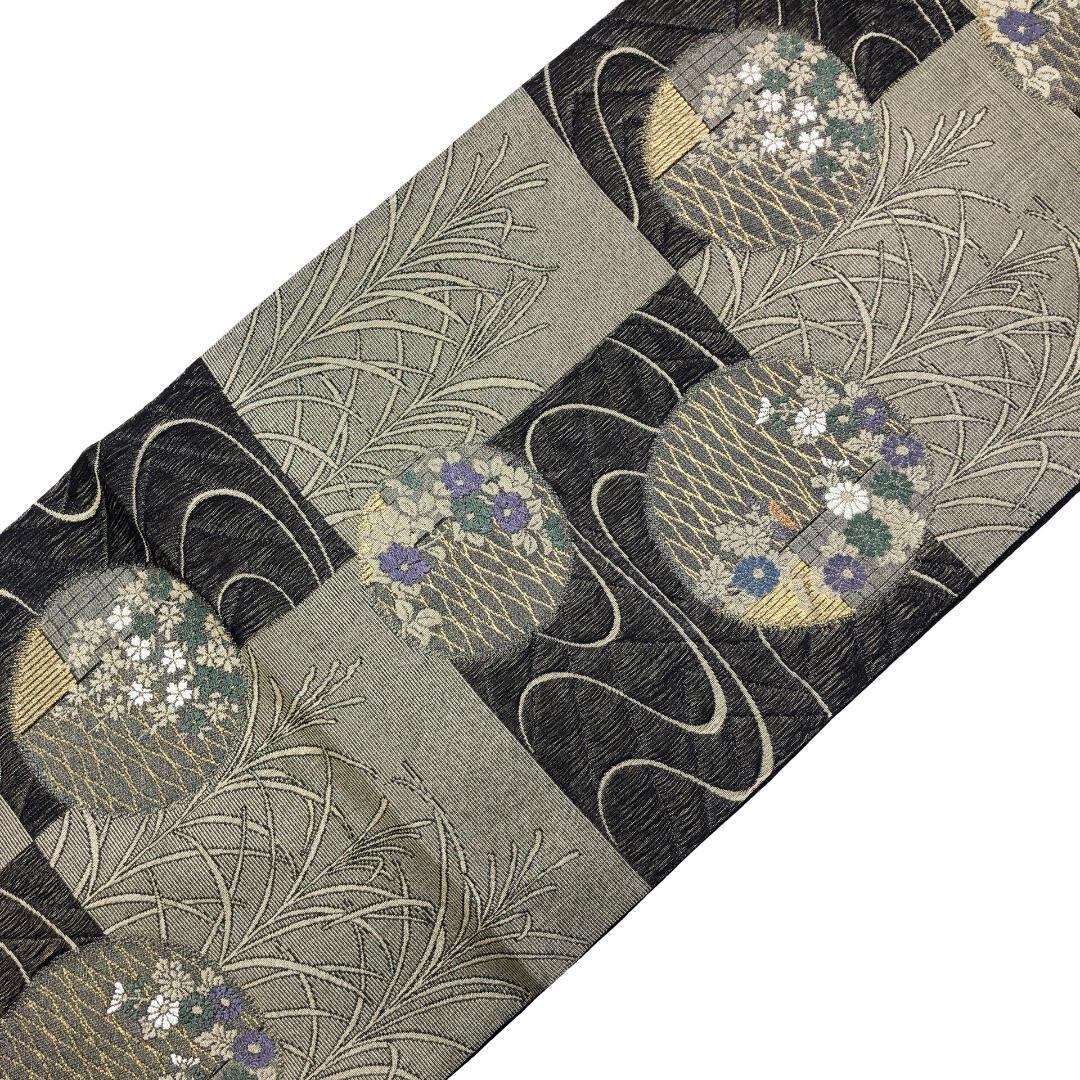 縦すくい織の落ち着いたお色味、格子柄に流水、丸の中に花模様がデザインされた雰囲気の良い素敵なお品でございます。