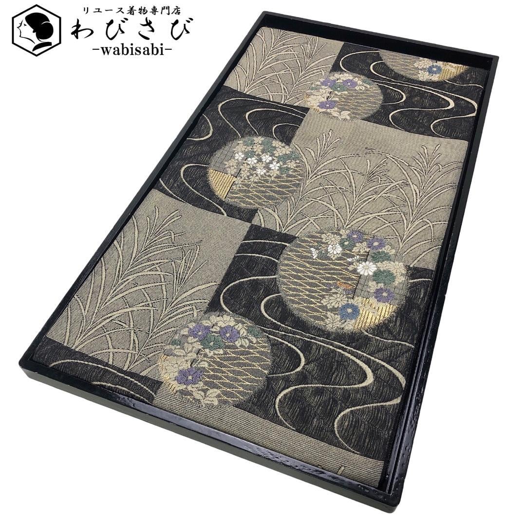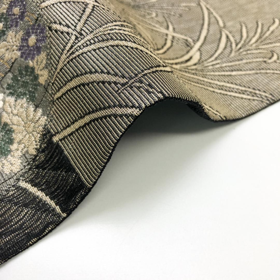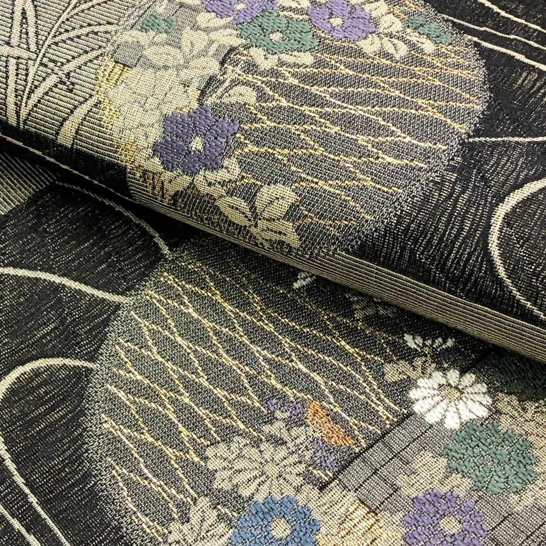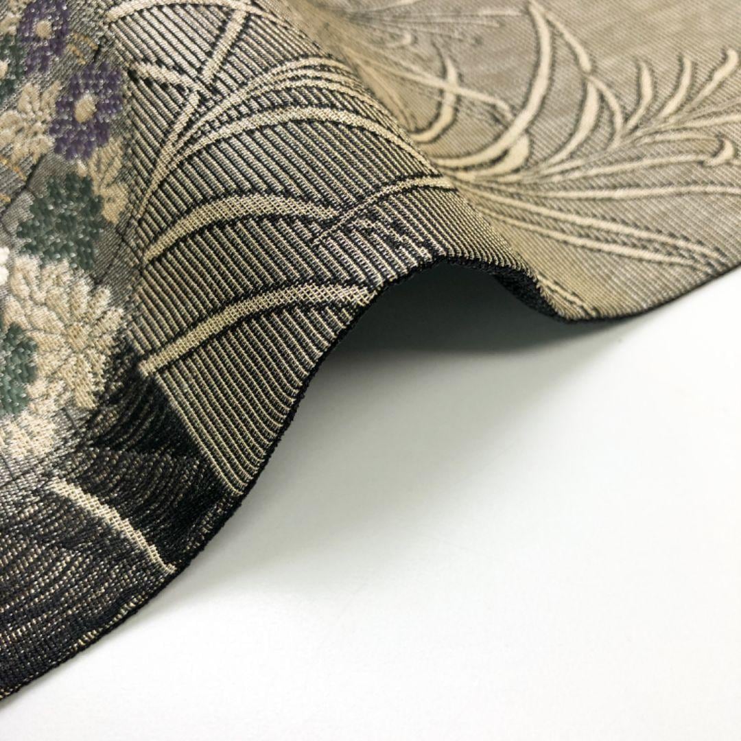 縦すくい織の落ち着いたお色味、格子柄に流水、丸の中に花模様がデザインされた雰囲気の良い素敵なお品でございます。