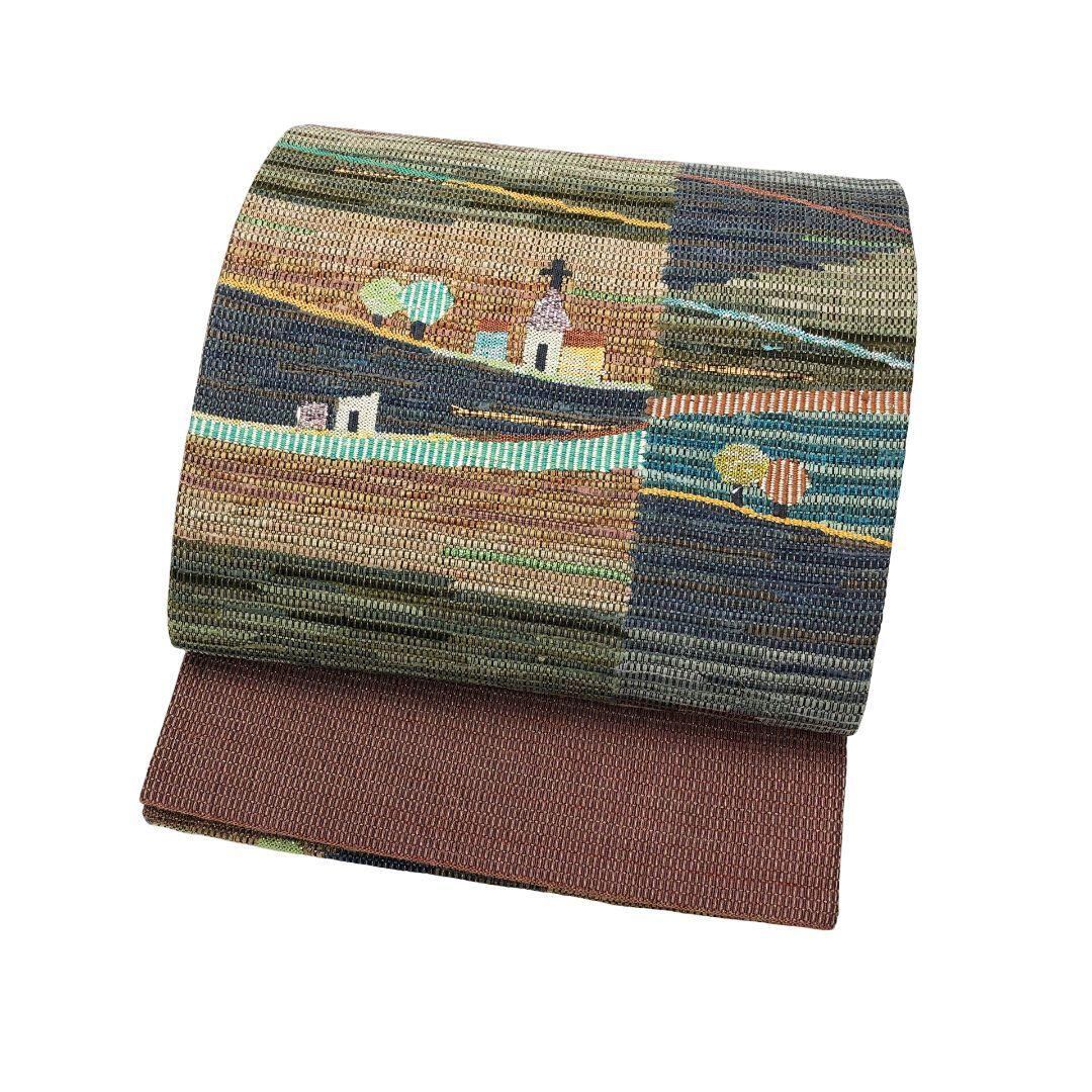 袋帯 抽象風景柄 教会 カジュアル 深蘇芳色 O-5012 着物 きもの kimono 和服 和装 中古 リサイクル着物 【送料無料】