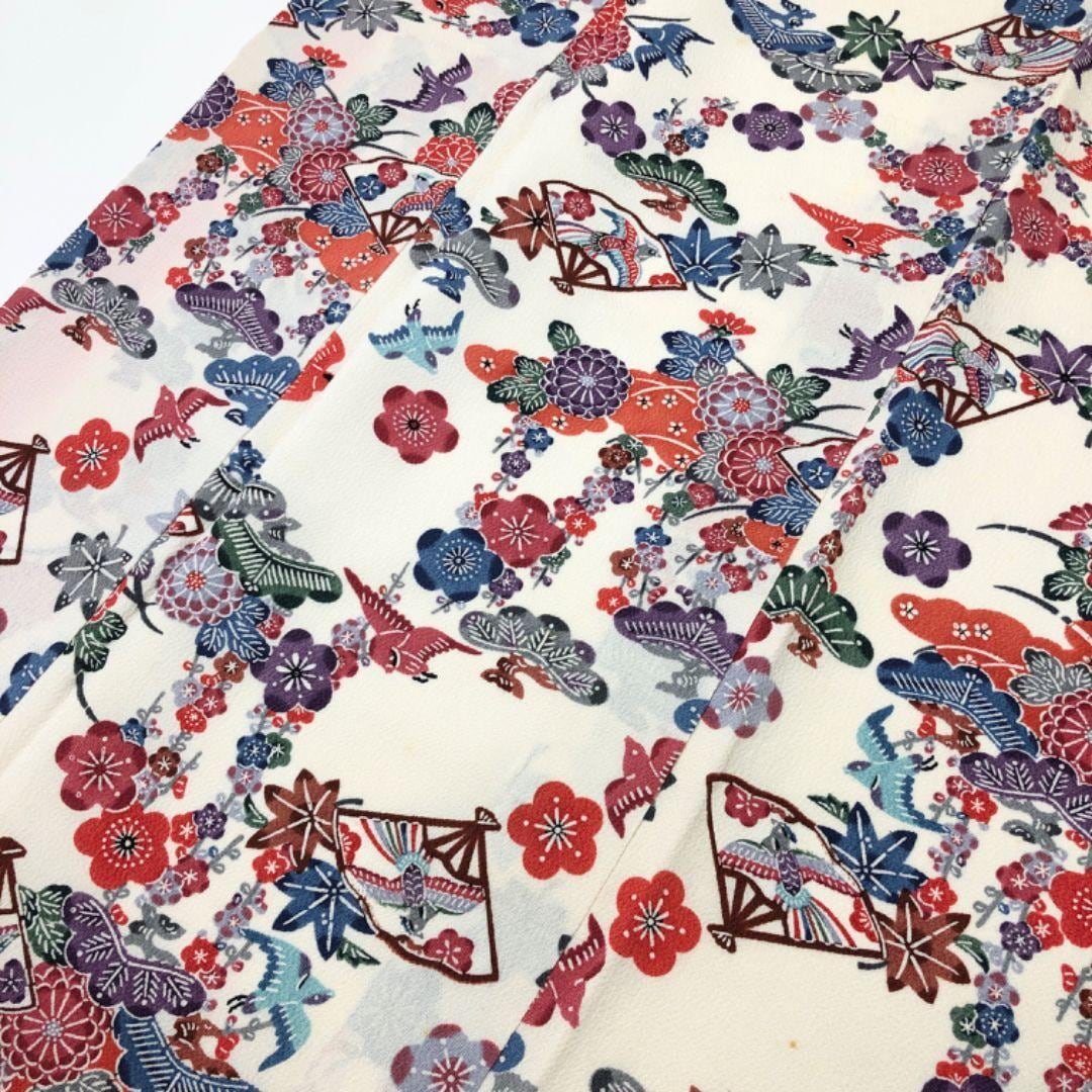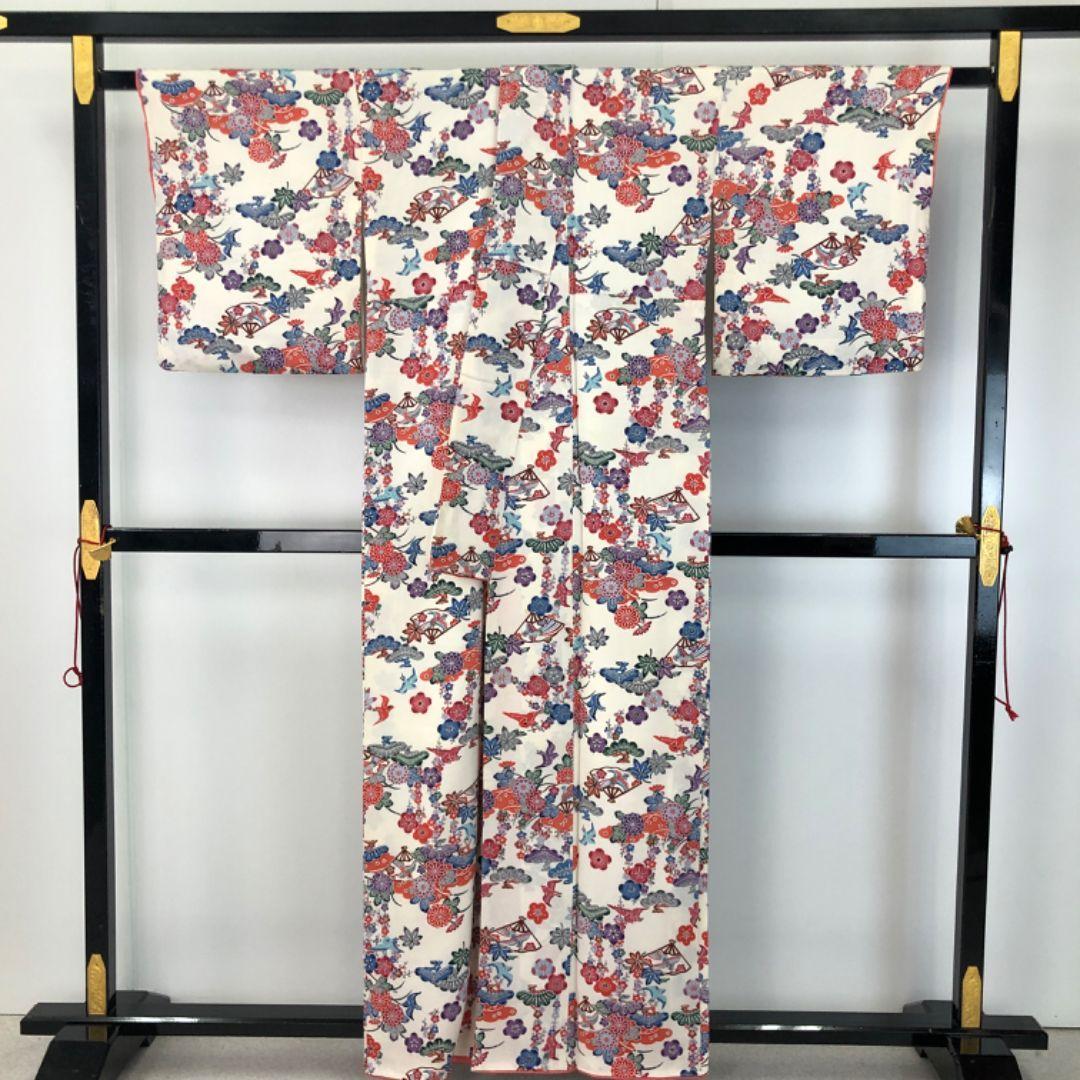 小紋 色鮮やかな型染 扇子に鳥 霞に花模様 乳白色 縮緬 K-4626 着物 きもの kimono 和服 和装 中古 リサイクル着物 【送料無料】