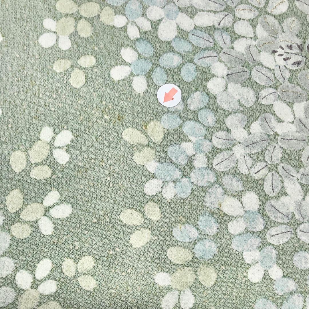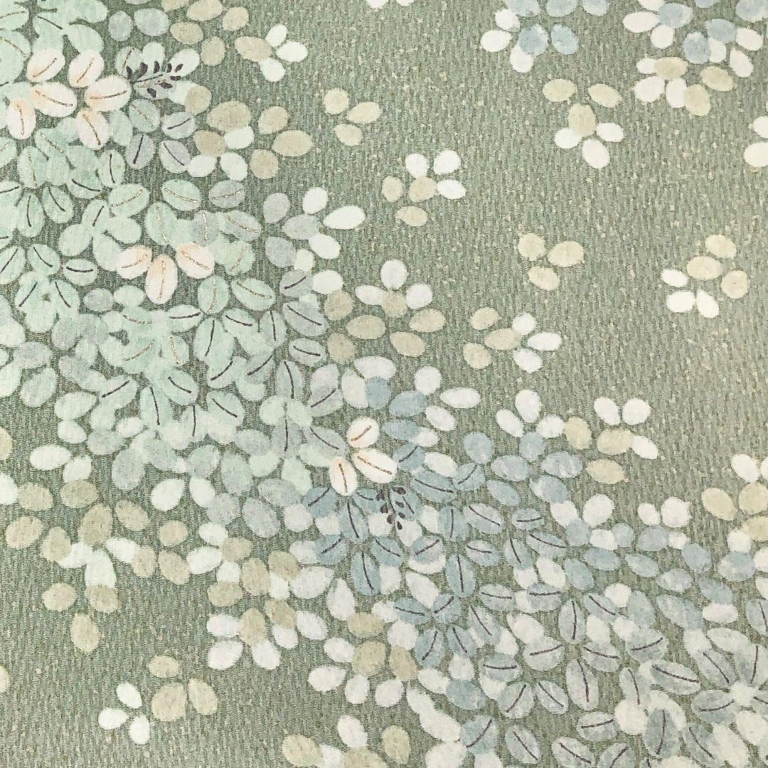 薄裏葉色の柔らかいお色味の縮緬に斜め柄の萩の花模様の雰囲気の良い柄裄がデザインされた素敵なお品でございます。