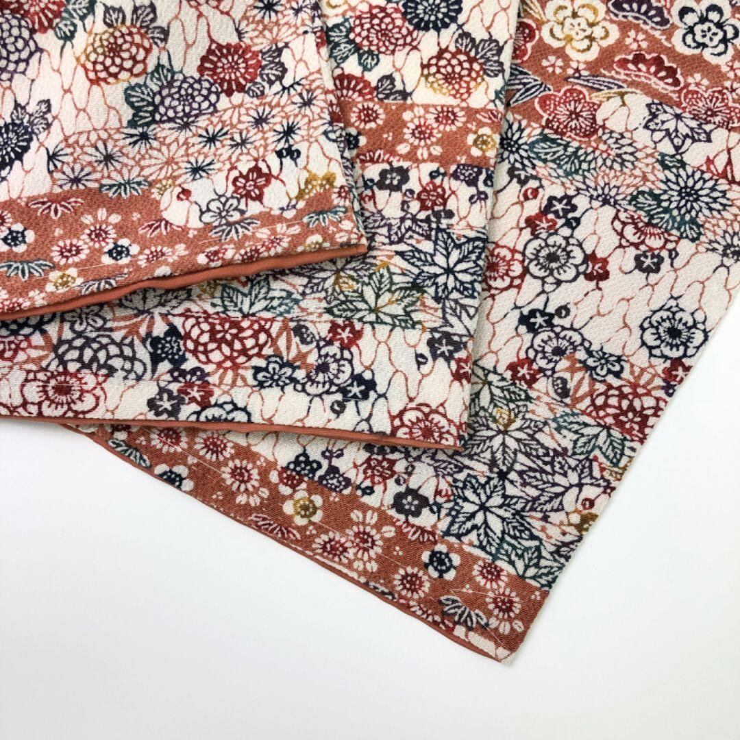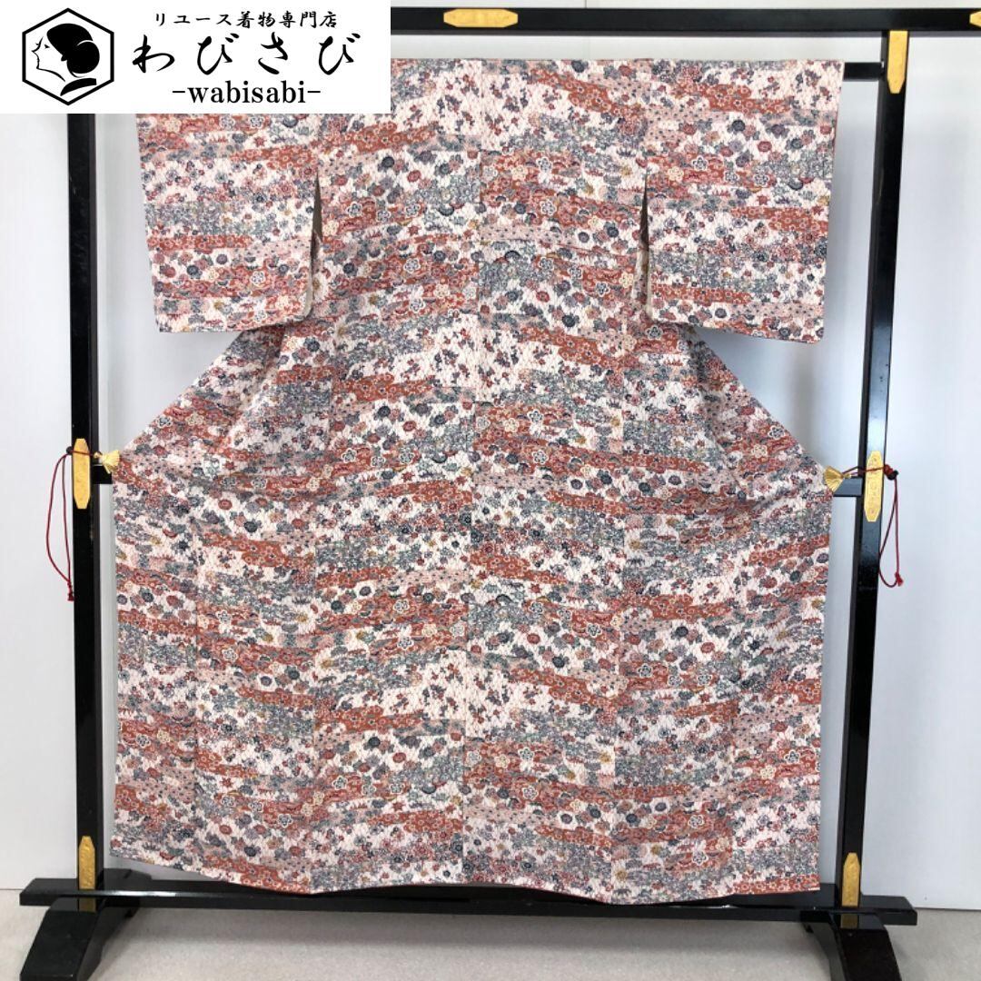 小紋 型染 霞に花模様 乳白色 縮緬 しつけ糸 K-4644 着物 きもの kimono 和服 和装 中古 リサイクル着物 【送料無料】