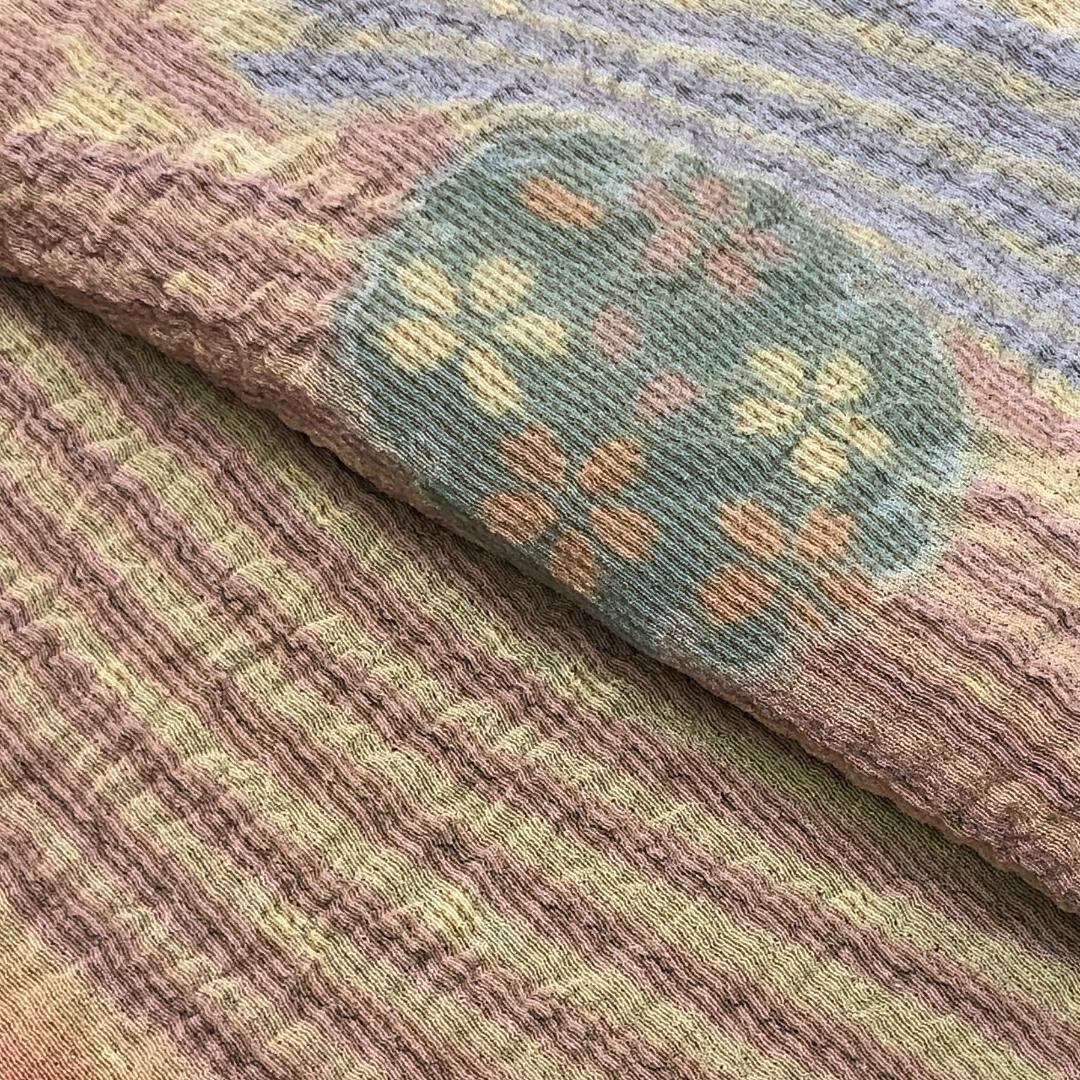 暗紅色のお色味に絞り柄で雪輪に波模様の柄裄がデザインされた素敵なお品でございます。