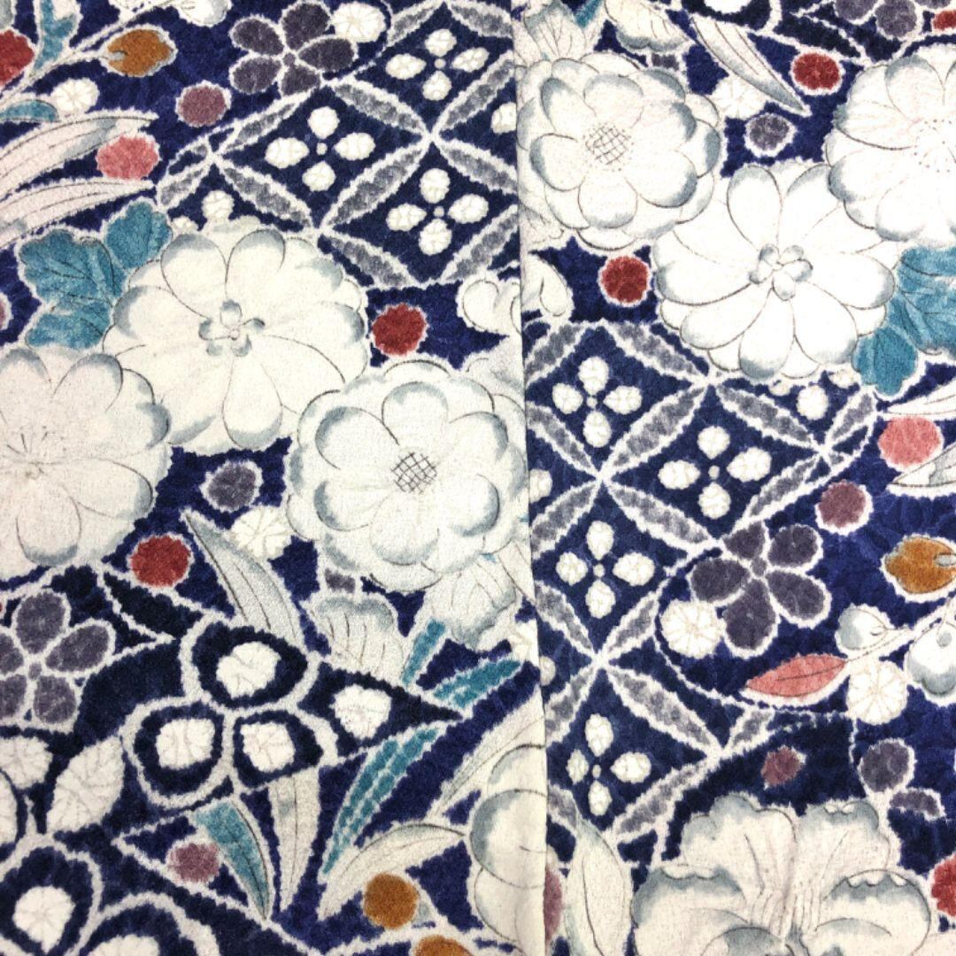 紺鉄色のお色味の縮緬に美しい絞り辻が花模様がデザインされた素敵な柄行のお品でございます。
