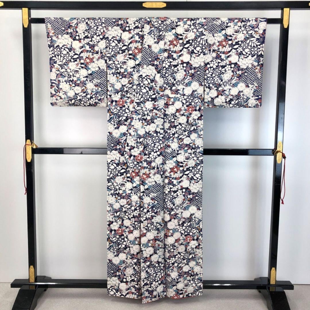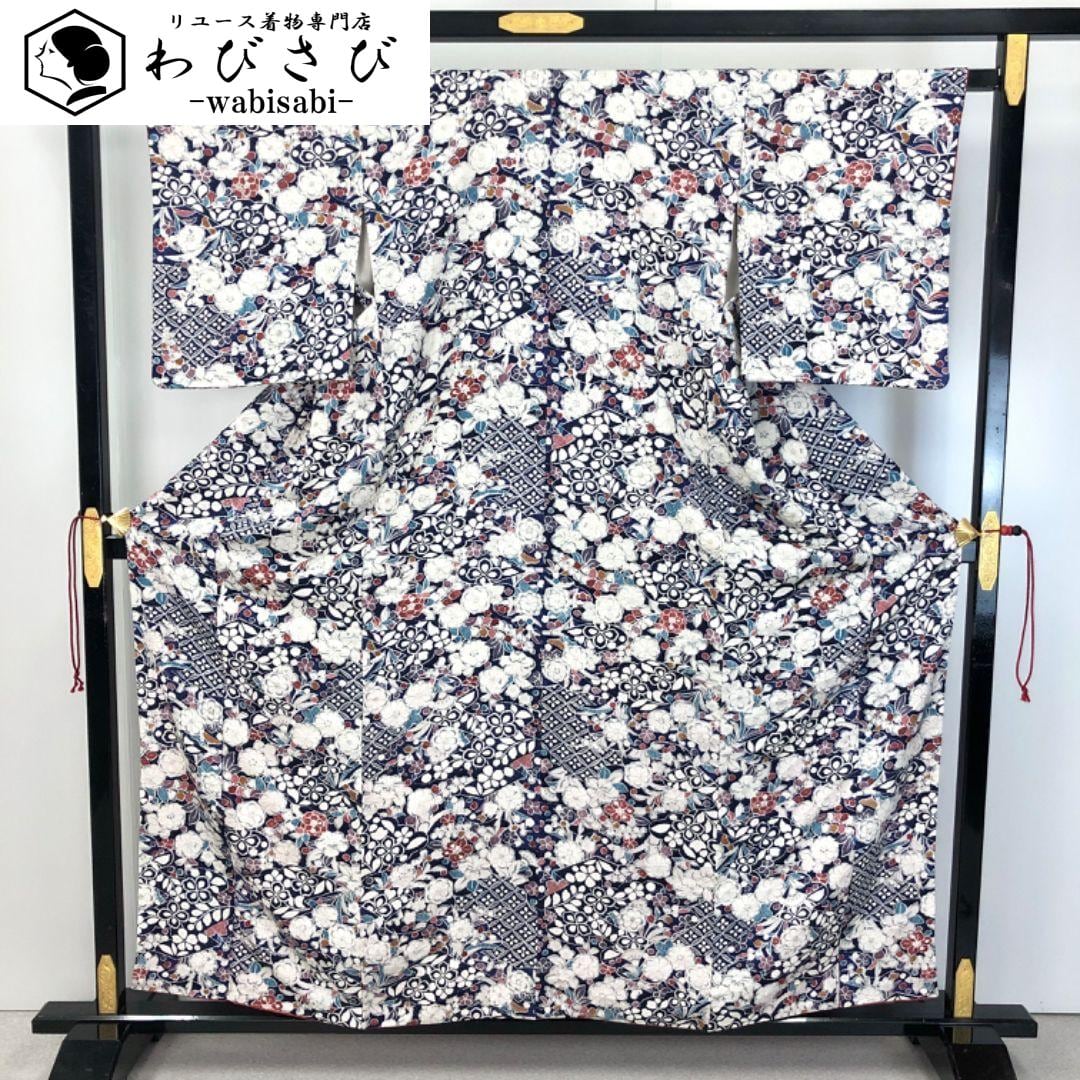 小紋 美しい辻が花模様 紺鉄色 縮緬 K-4665 着物 きもの kimono 和服 和装 中古 リサイクル着物 【送料無料】