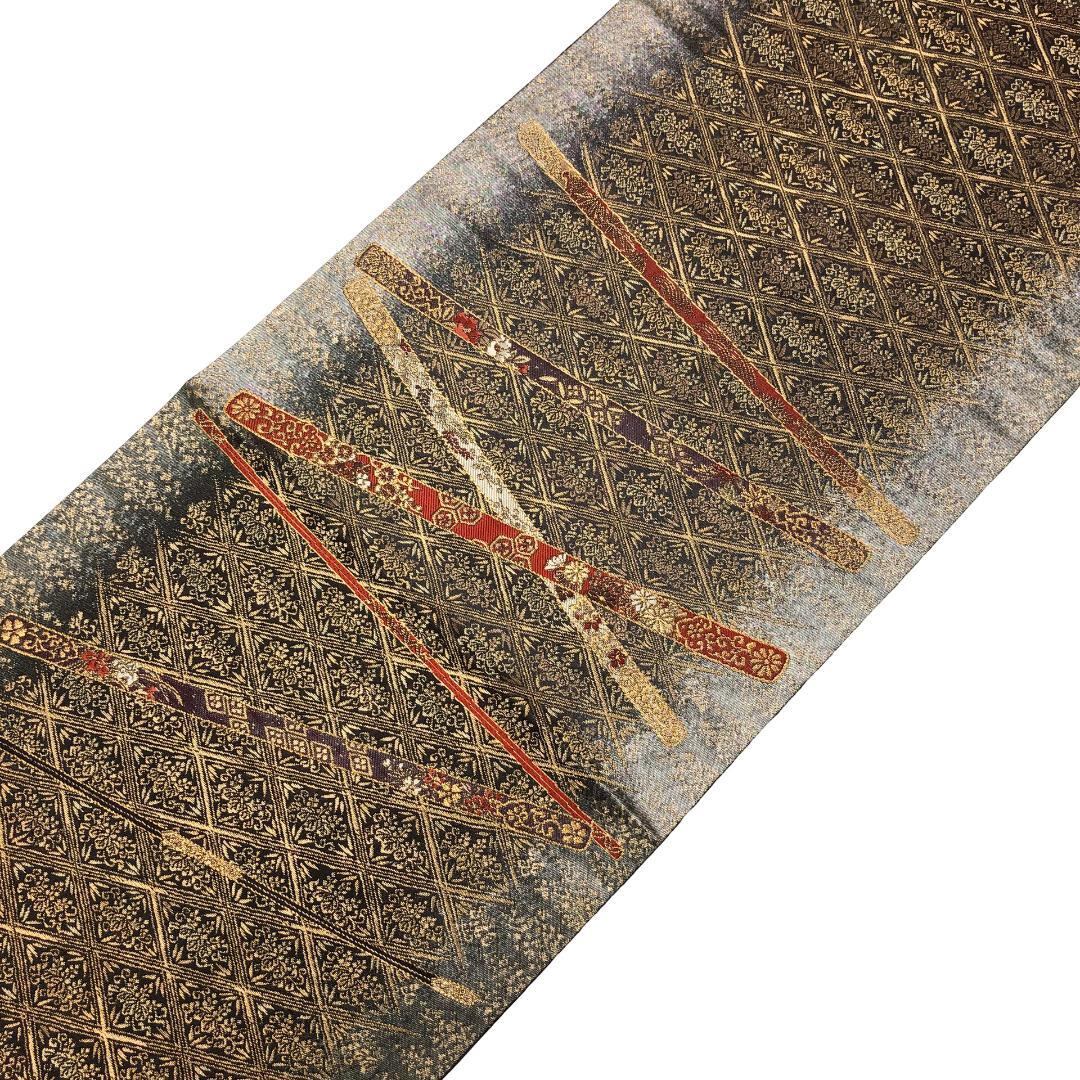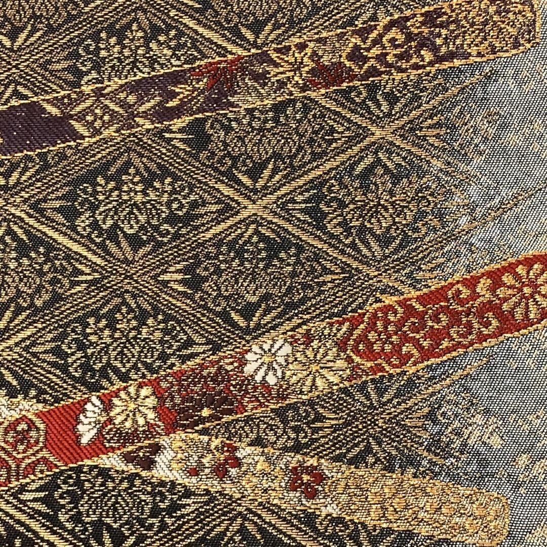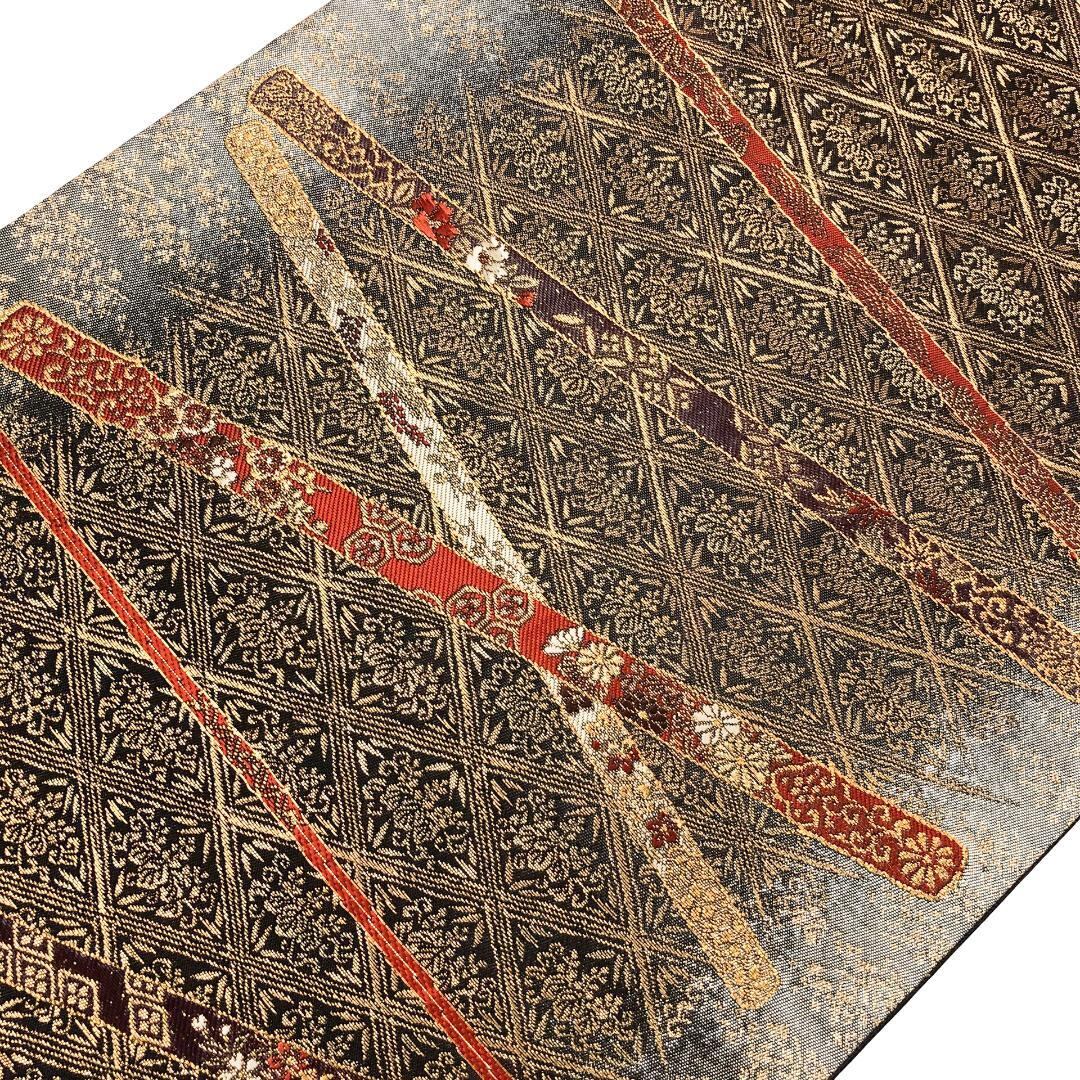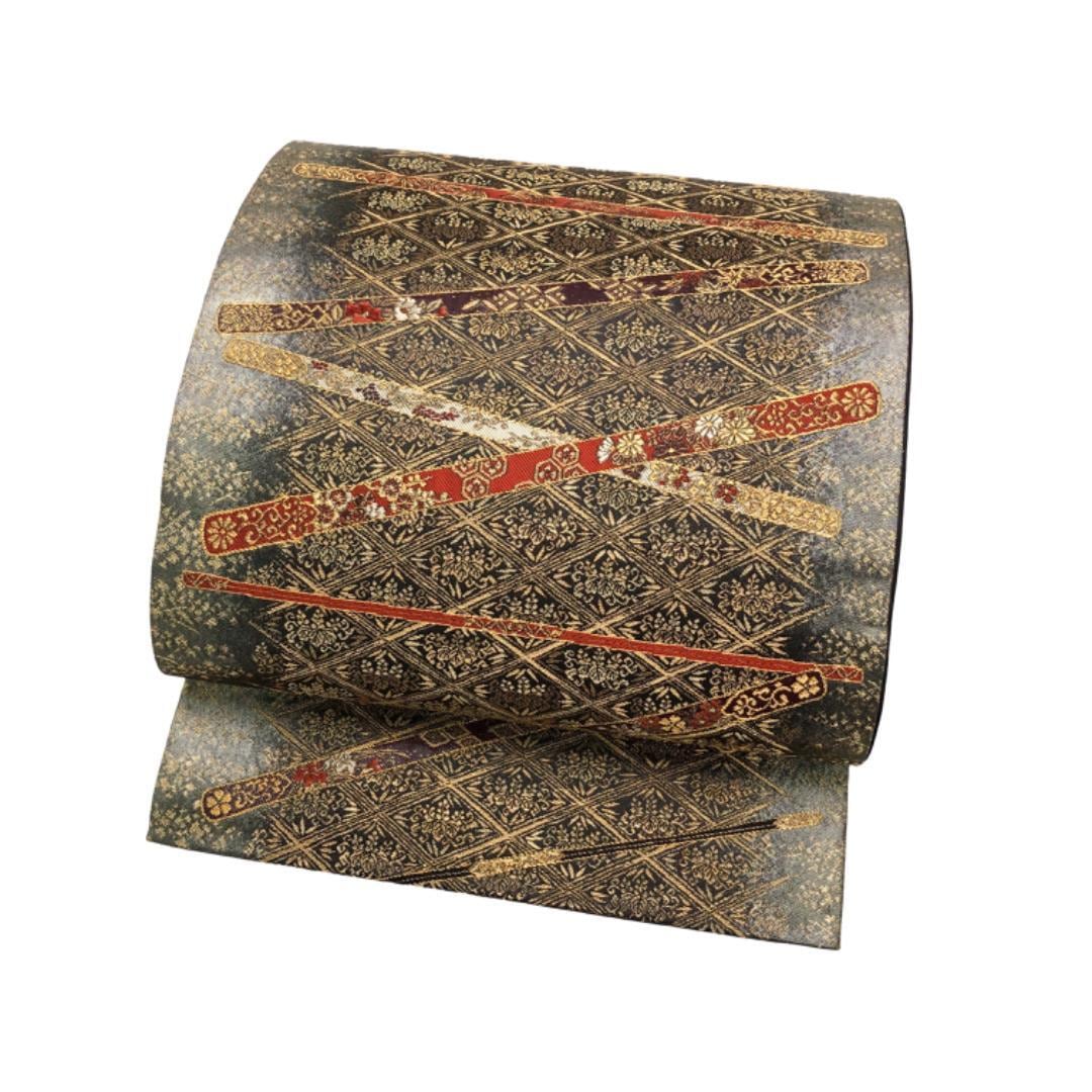 金糸が使われた落ち着いた色彩、菱形に桐の花柄模様がデザインされた素敵なお品でございます。