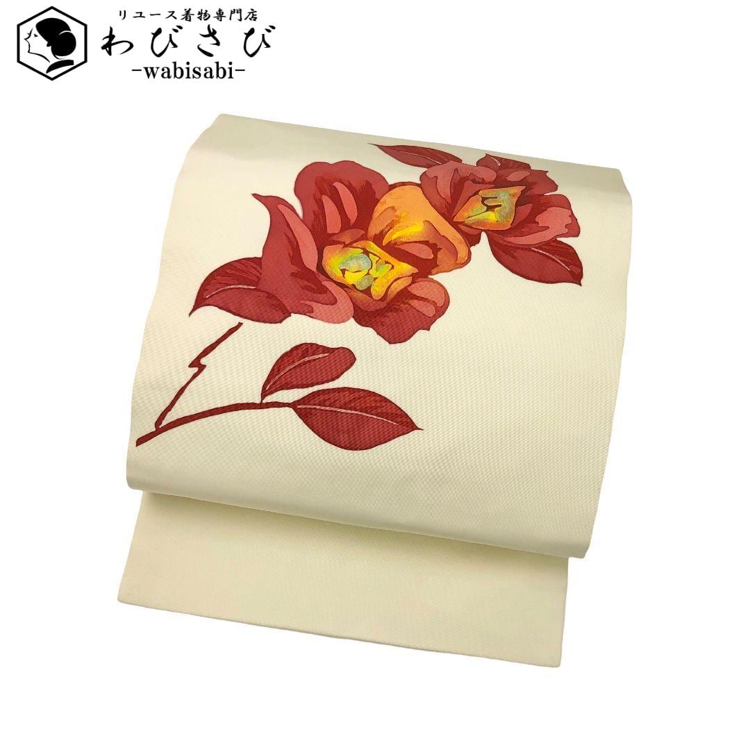 名古屋帯 塩瀬 手描き 花模様 鳥の子色 O-5019 着物 きもの kimono 和服 和装 中古 リサイクル着物 【送料無料】