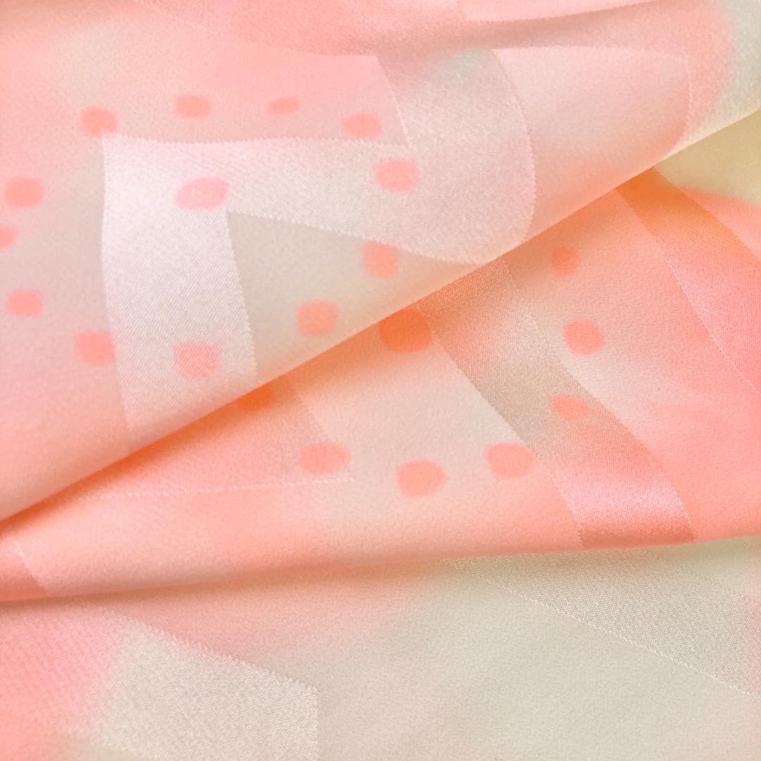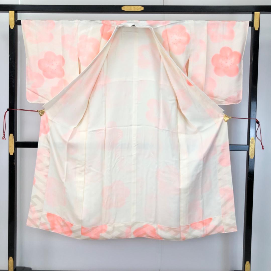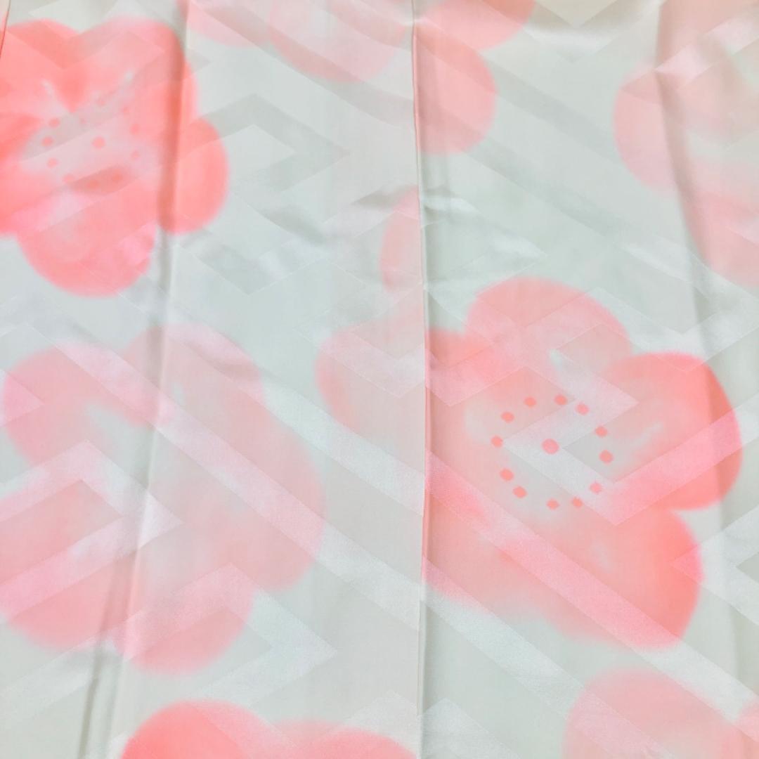 乳白色のお色味に梅の花模様の柄裄がデザインされた素敵なお品でございます。