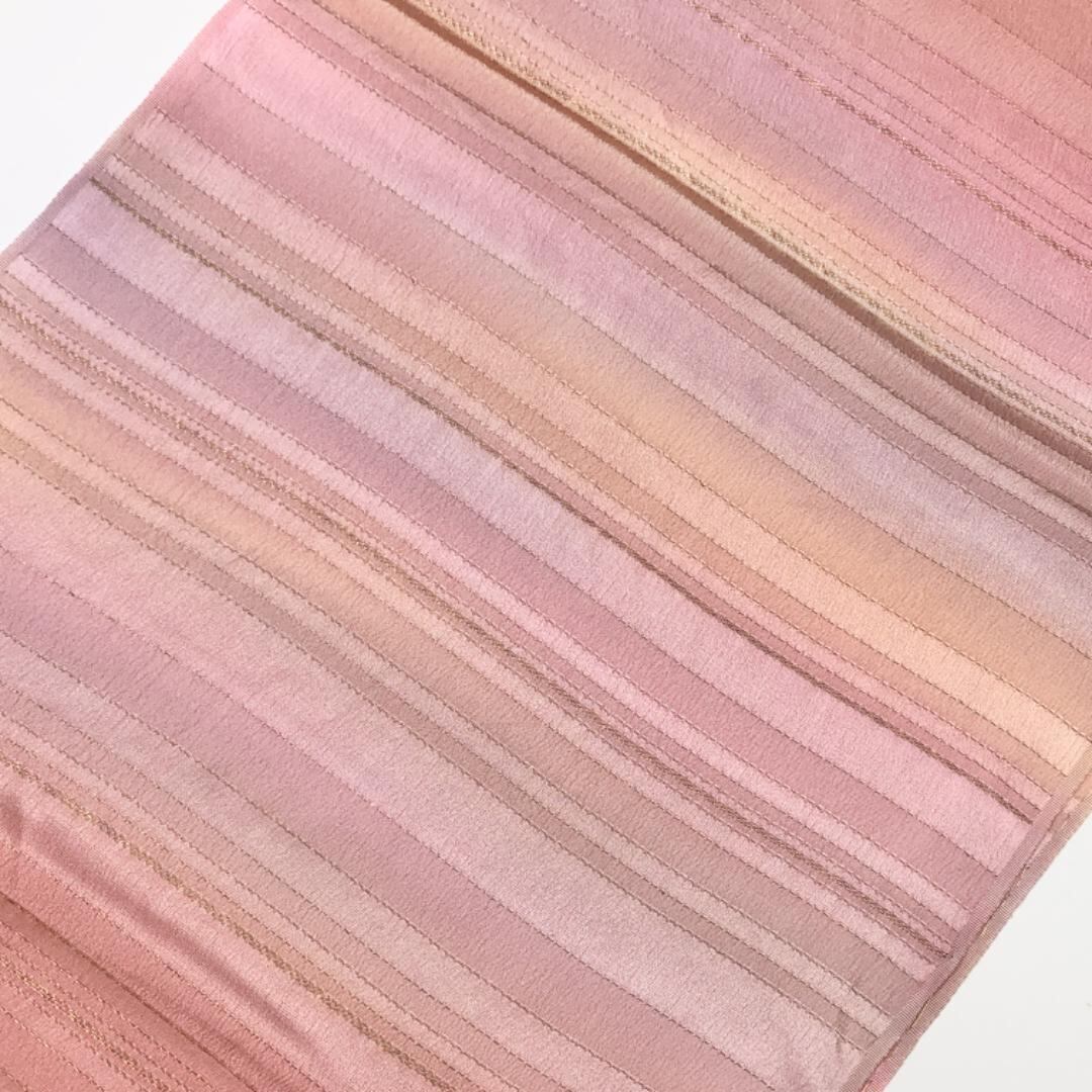 退紅色ベースの暈しのお色味に横縞模様の柄裄がデザインされた素敵なお品でございます。