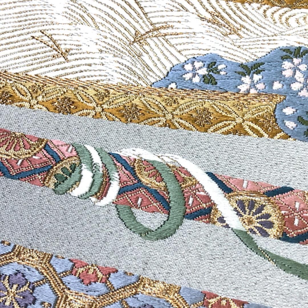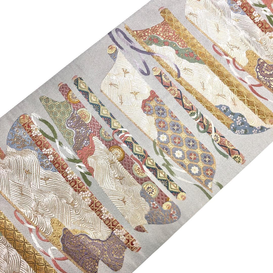 銀色のお色味、巻物に花柄模様、松葉、波模様などがデザインされた素敵な柄行のお品でございます。