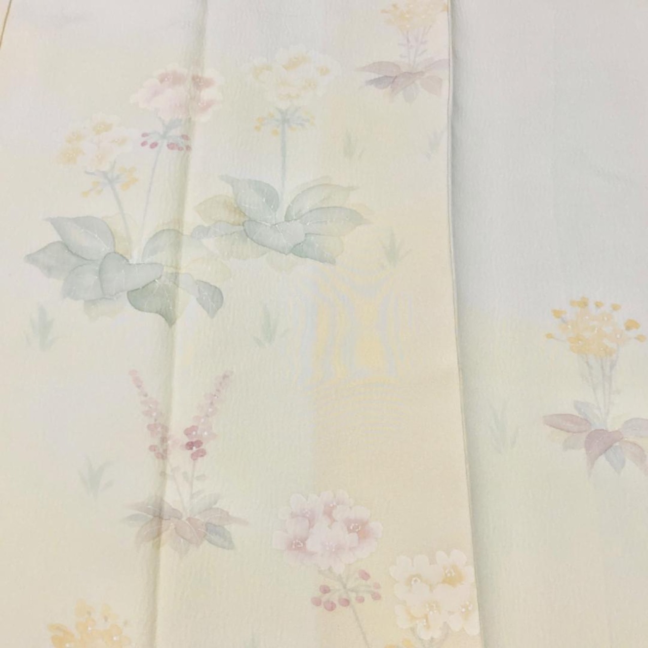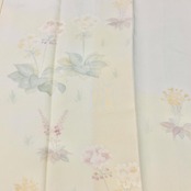 鳥の子色のお色味の縮緬に可愛い花模様の柄裄がデザインされた素敵なお品でございます。