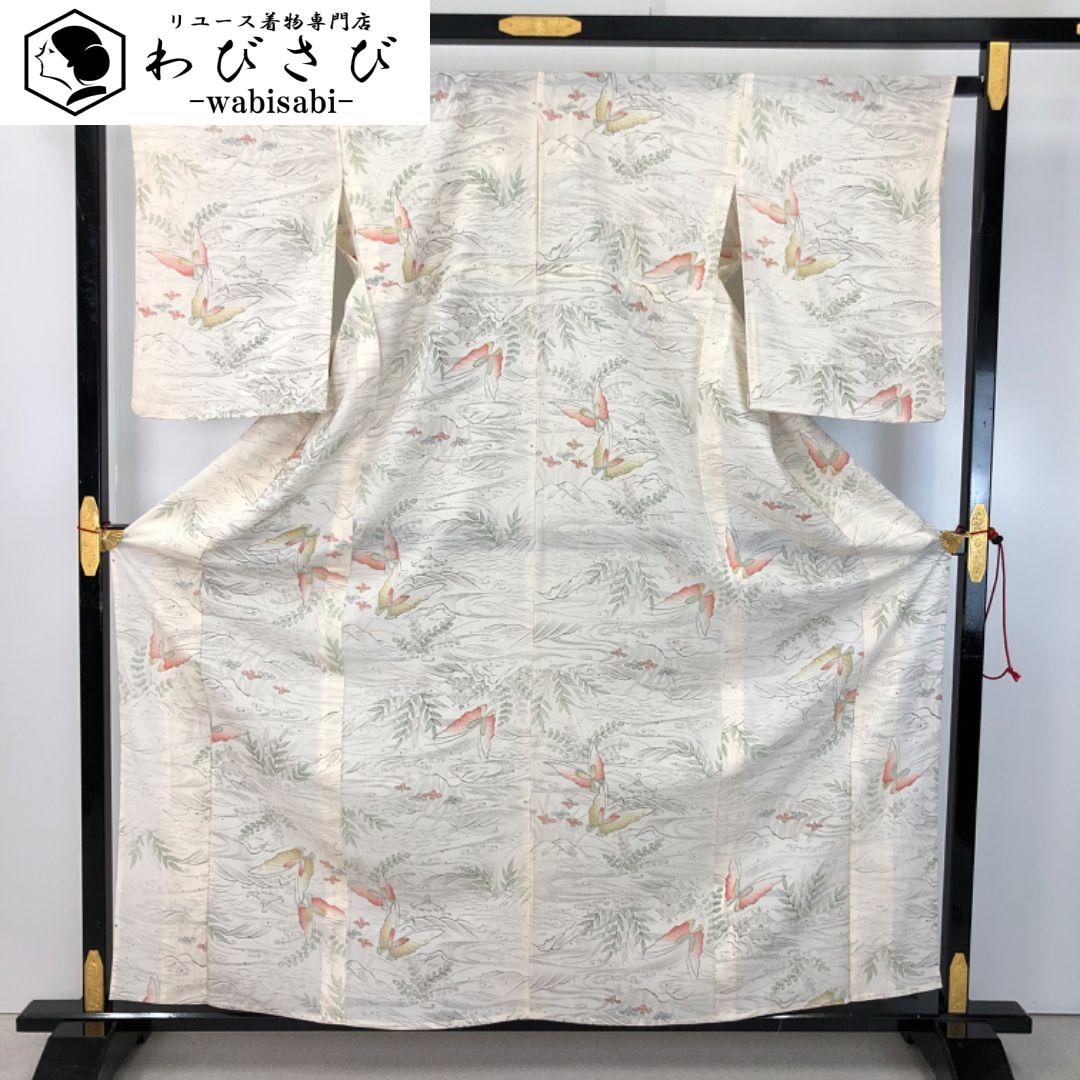 夏着物 小紋 絽 風景に蝶々 花模様 流水に萩 乳白色 K-4658 着物 きもの kimono 和服 和装 中古 リサイクル着物 【送料無料】