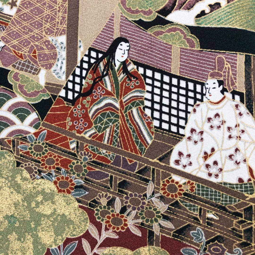 エ霞模様の中に十二単を着た女性などの柄行がデザインされた素敵なお品でございます。