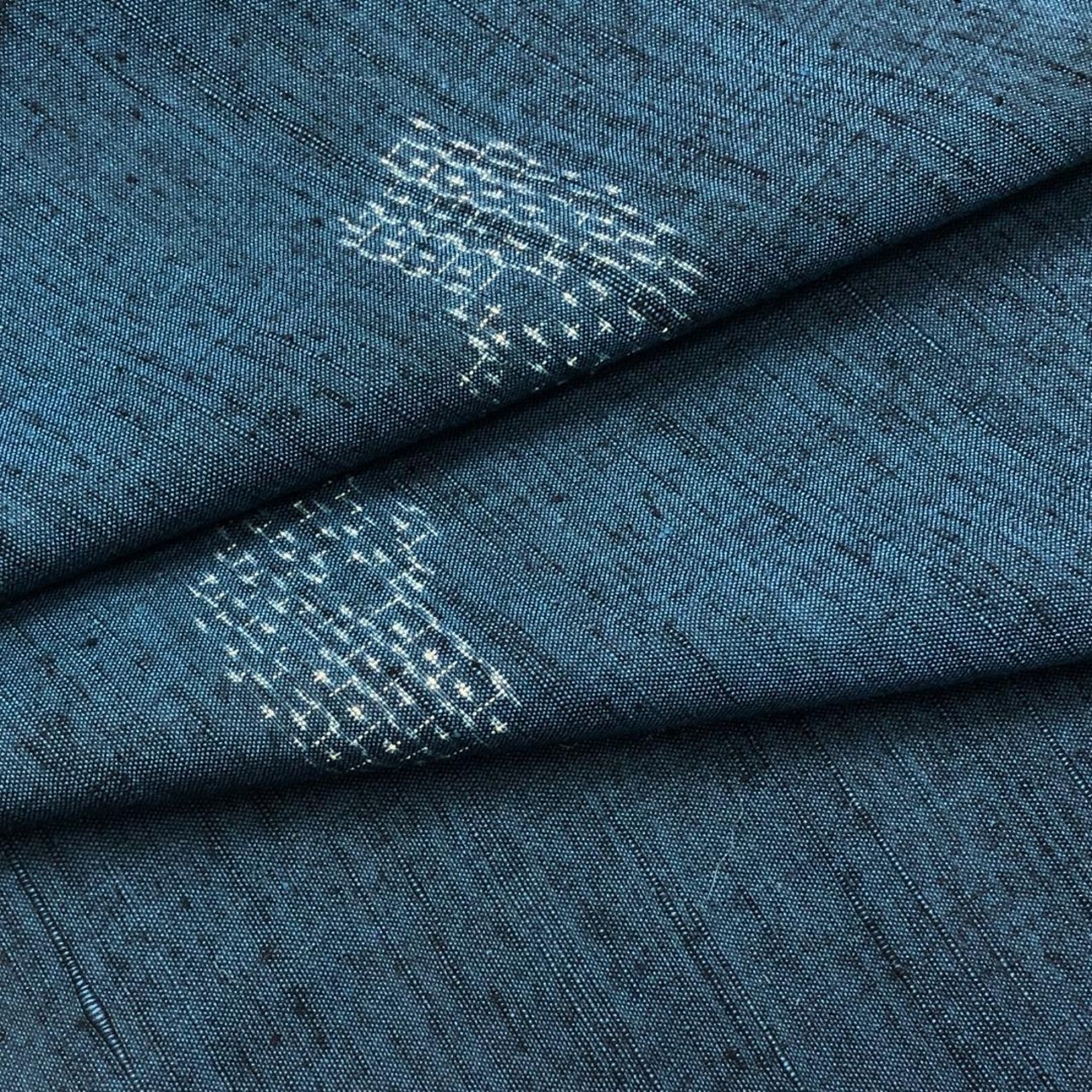 藍色の雰囲気の良いお色味の紬地に亀甲の扇面がデザインされた素敵な柄裄のお品でございます。
