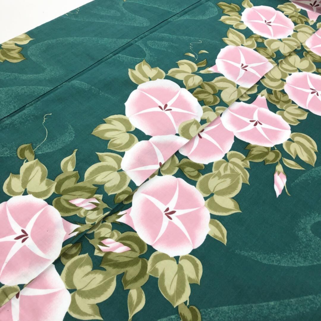 蒼色のお色味に朝顔の花模様がデザインされた素敵な柄裄お品でございます。