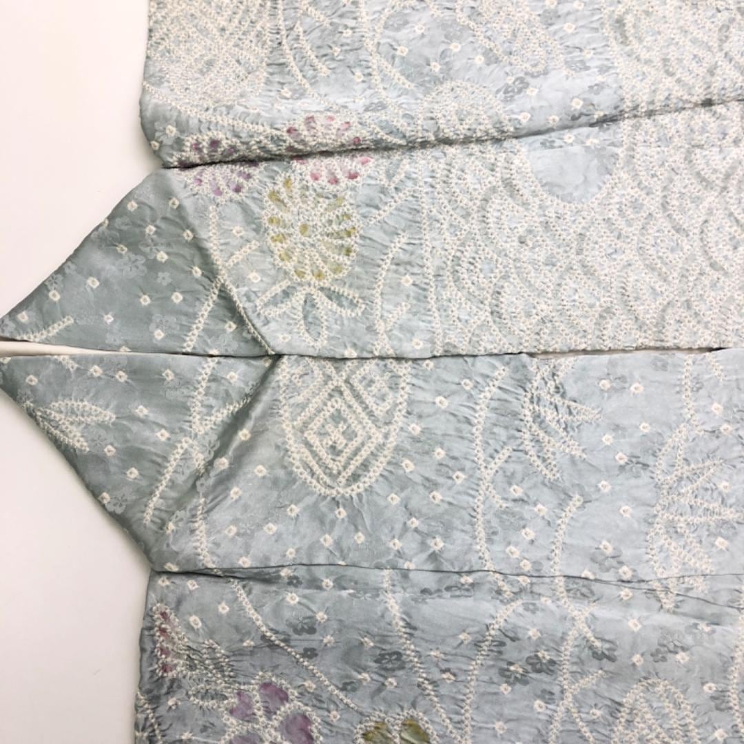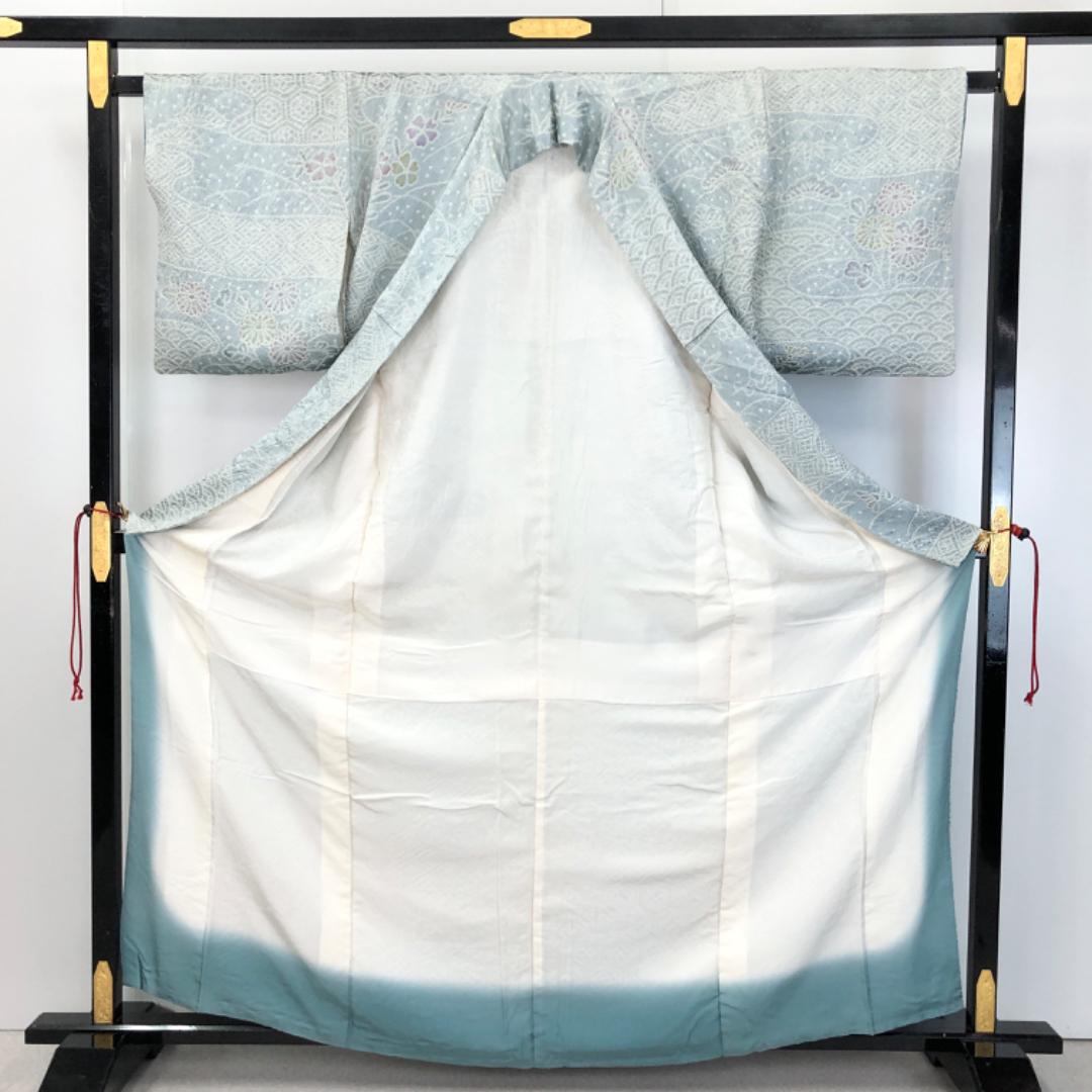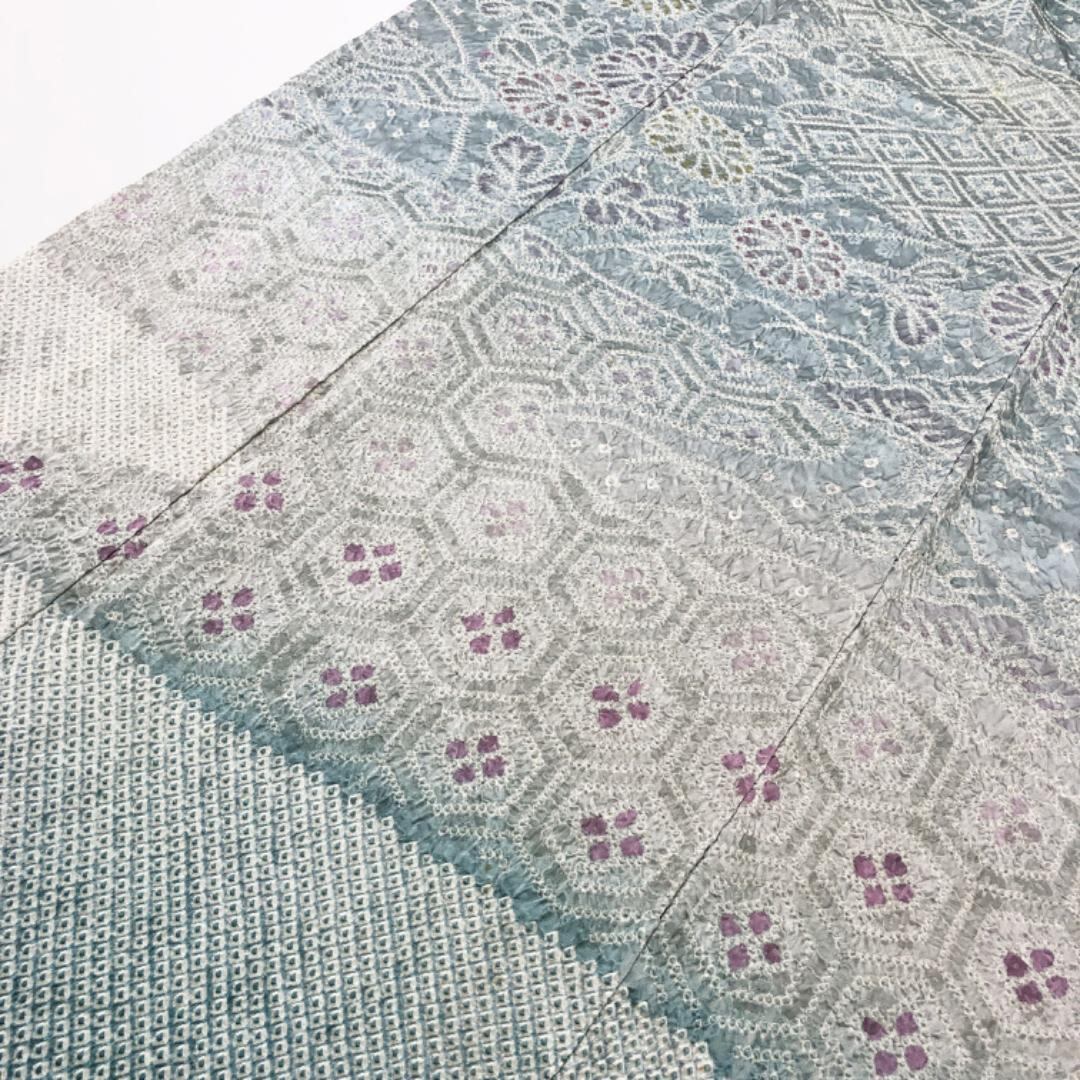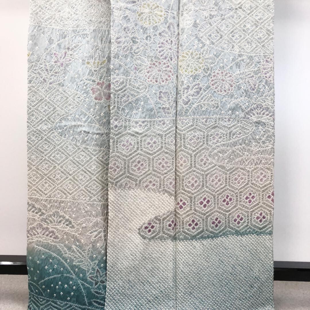 薄水色の上品なお色味に絞り柄の霞に花模様、花亀甲、七宝、青海波、松などの柄裄がデザインされた素敵なお品でございます。