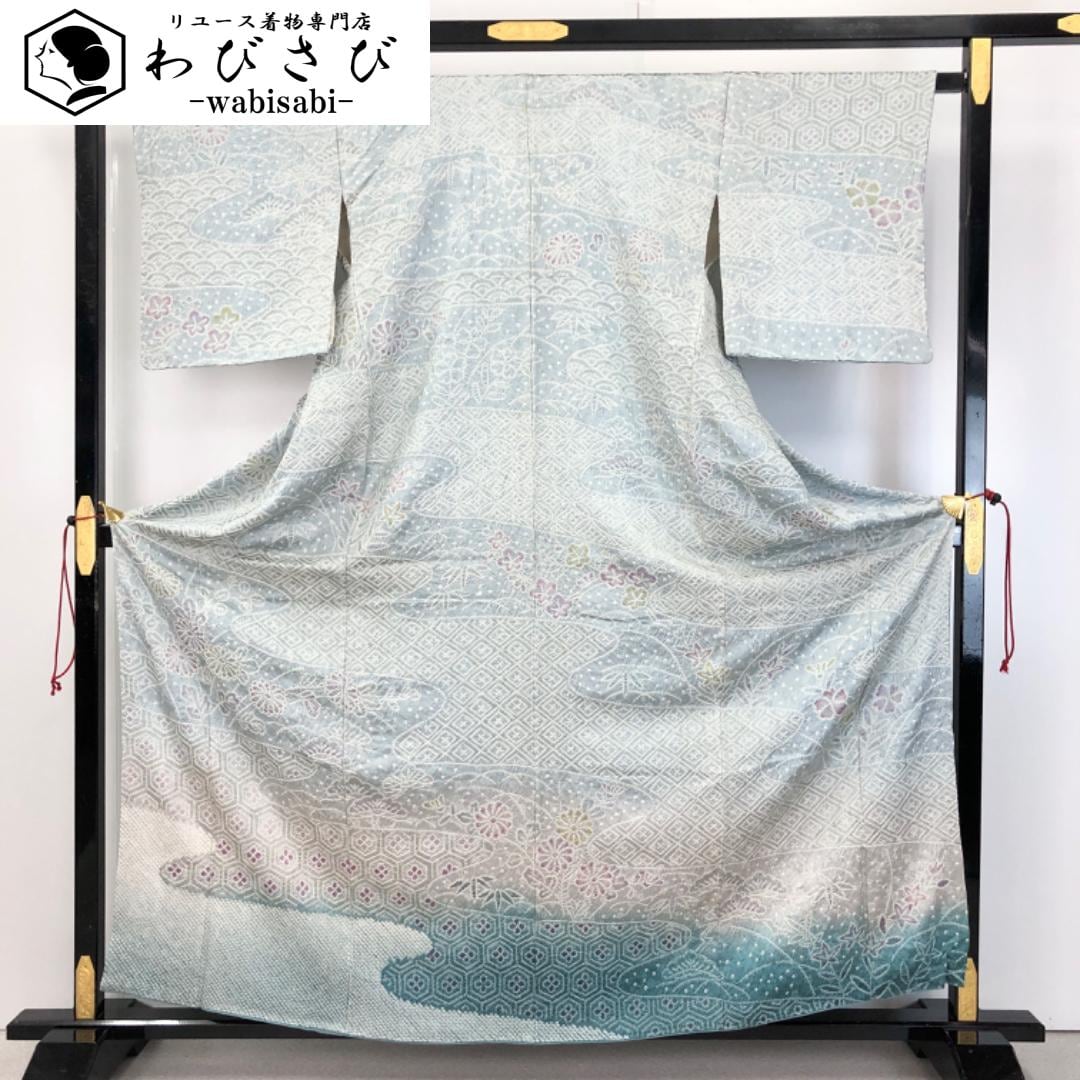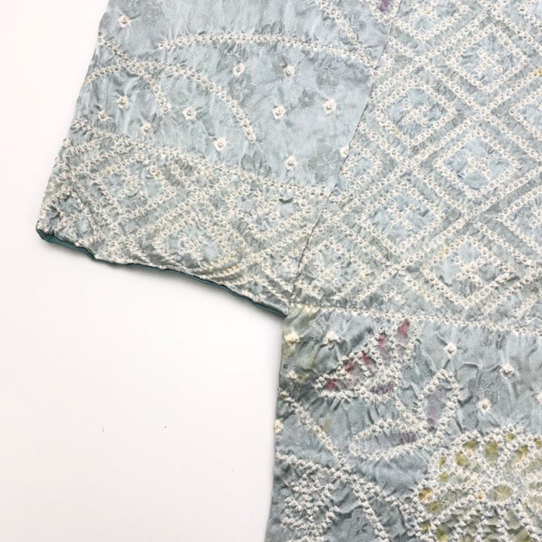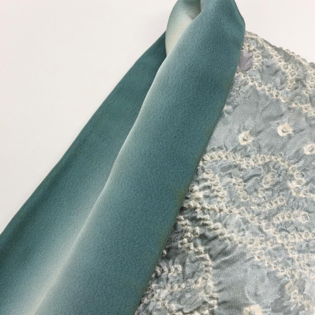 薄水色の上品なお色味に絞り柄の霞に花模様、花亀甲、七宝、青海波、松などの柄裄がデザインされた素敵なお品でございます。