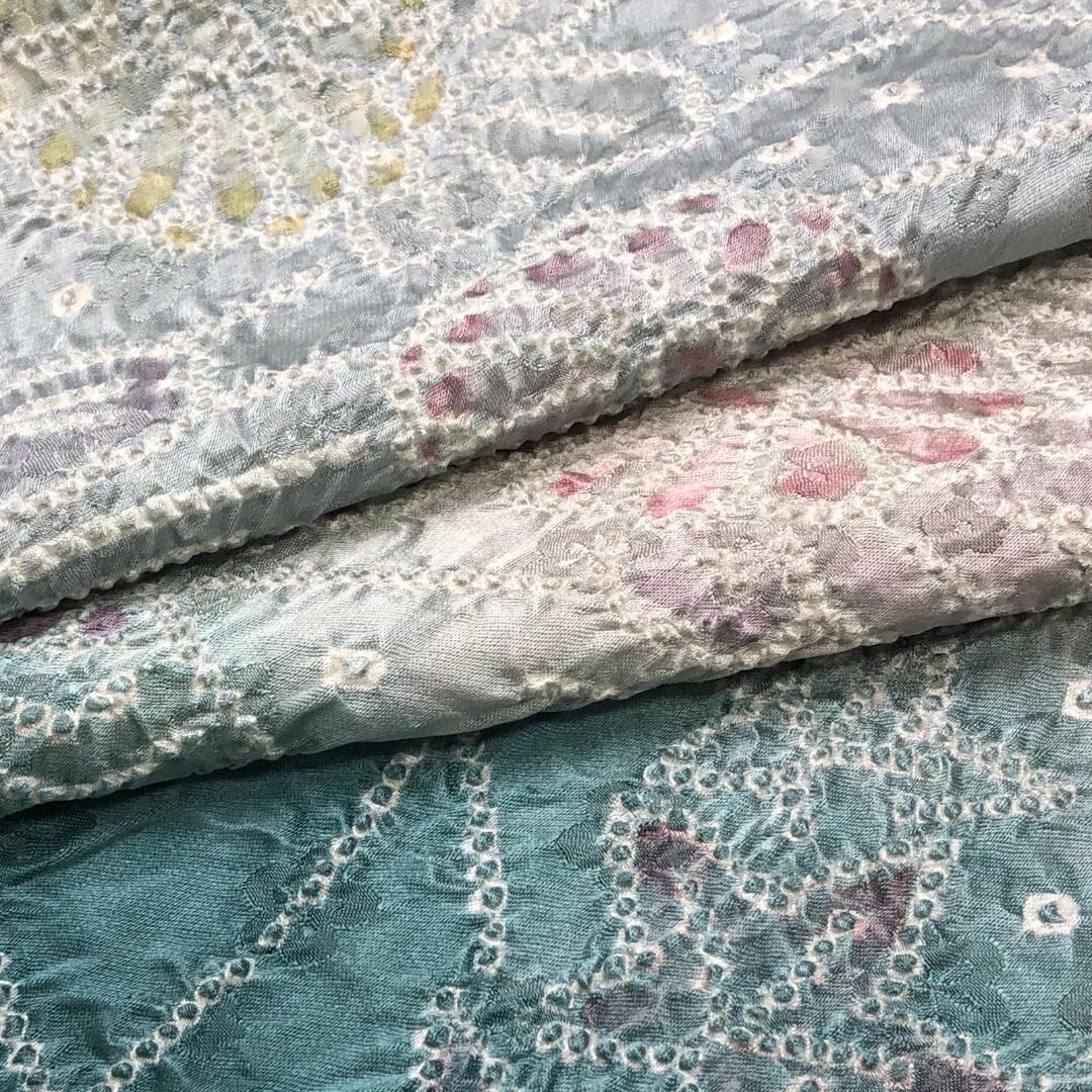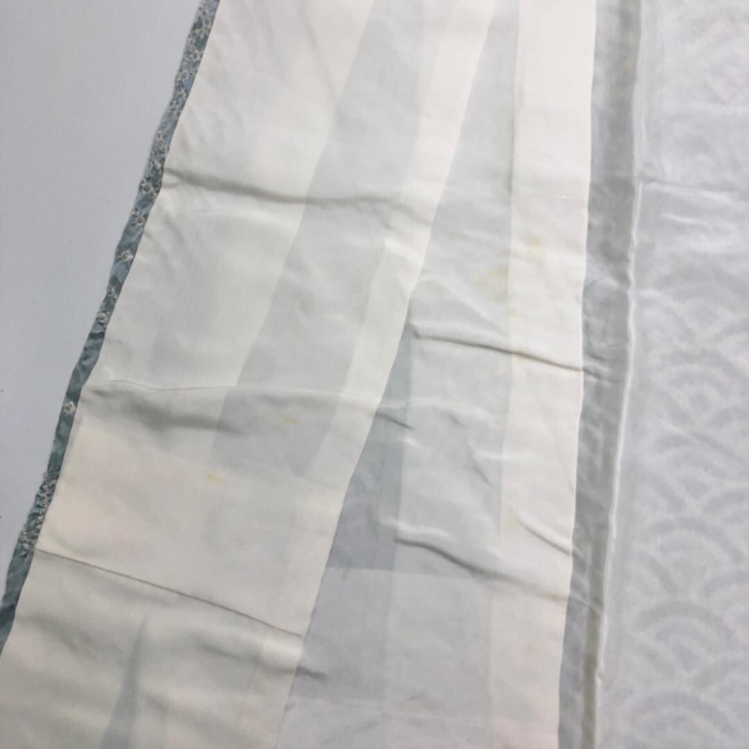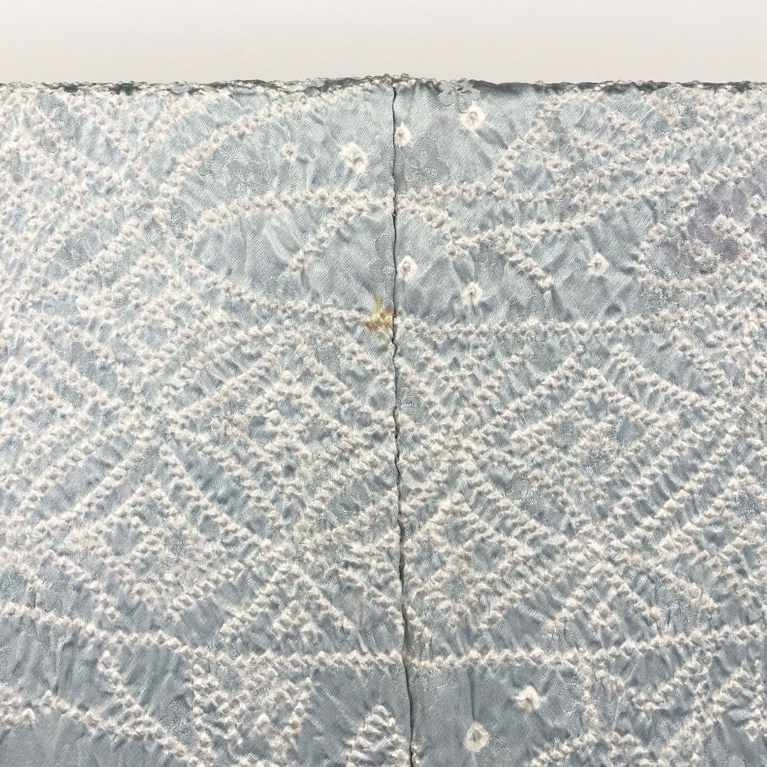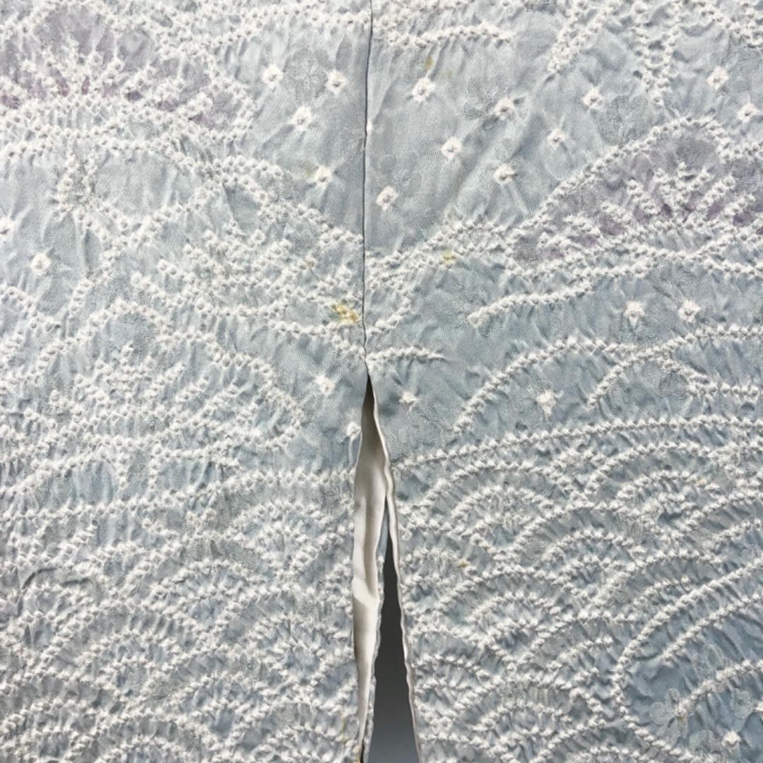 薄水色の上品なお色味に絞り柄の霞に花模様、花亀甲、七宝、青海波、松などの柄裄がデザインされた素敵なお品でございます。