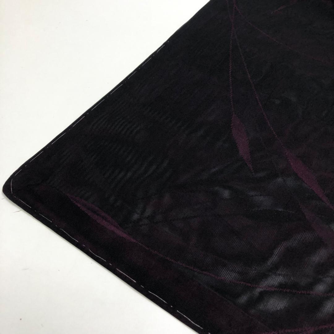 表は黒色、裏側は紅桔梗色のお色味に雰囲気の良い葉模様がデザインされた素敵な柄裄のお品でございます。