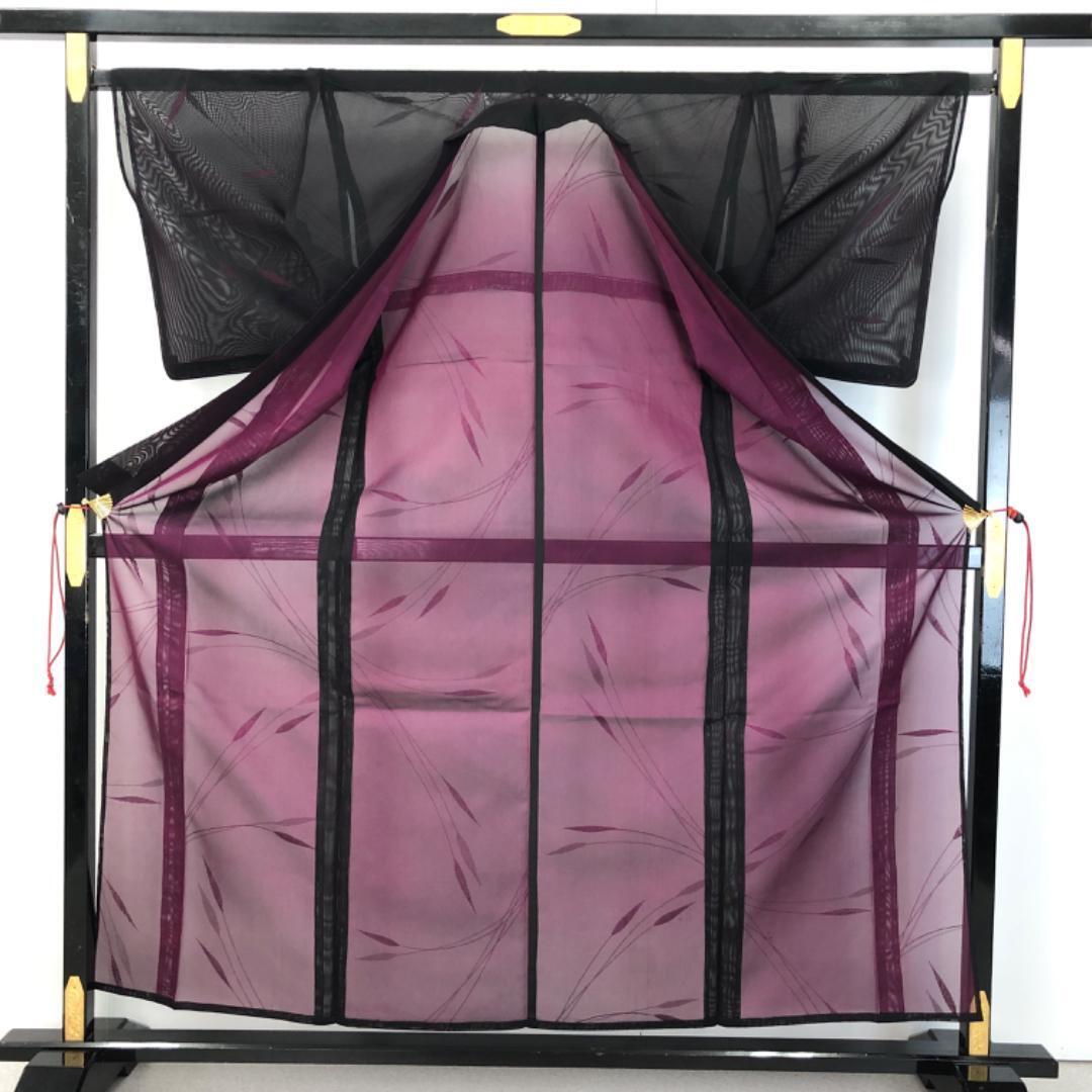 夏着物 小紋 二重紗 葉模様 黒色 しつけ糸 K-4675 着物 きもの kimono 和服 和装 中古 リサイクル着物 【送料無料】
