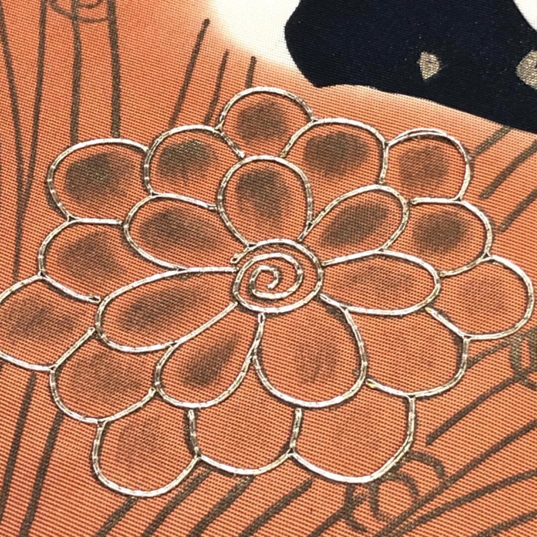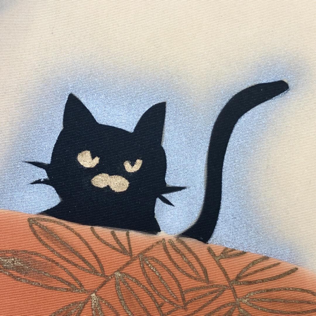 密陀僧色のお色味の塩瀬に可愛らしい4匹の黒猫、花柄模様の染め柄がデザインされた素敵なお品でございます。