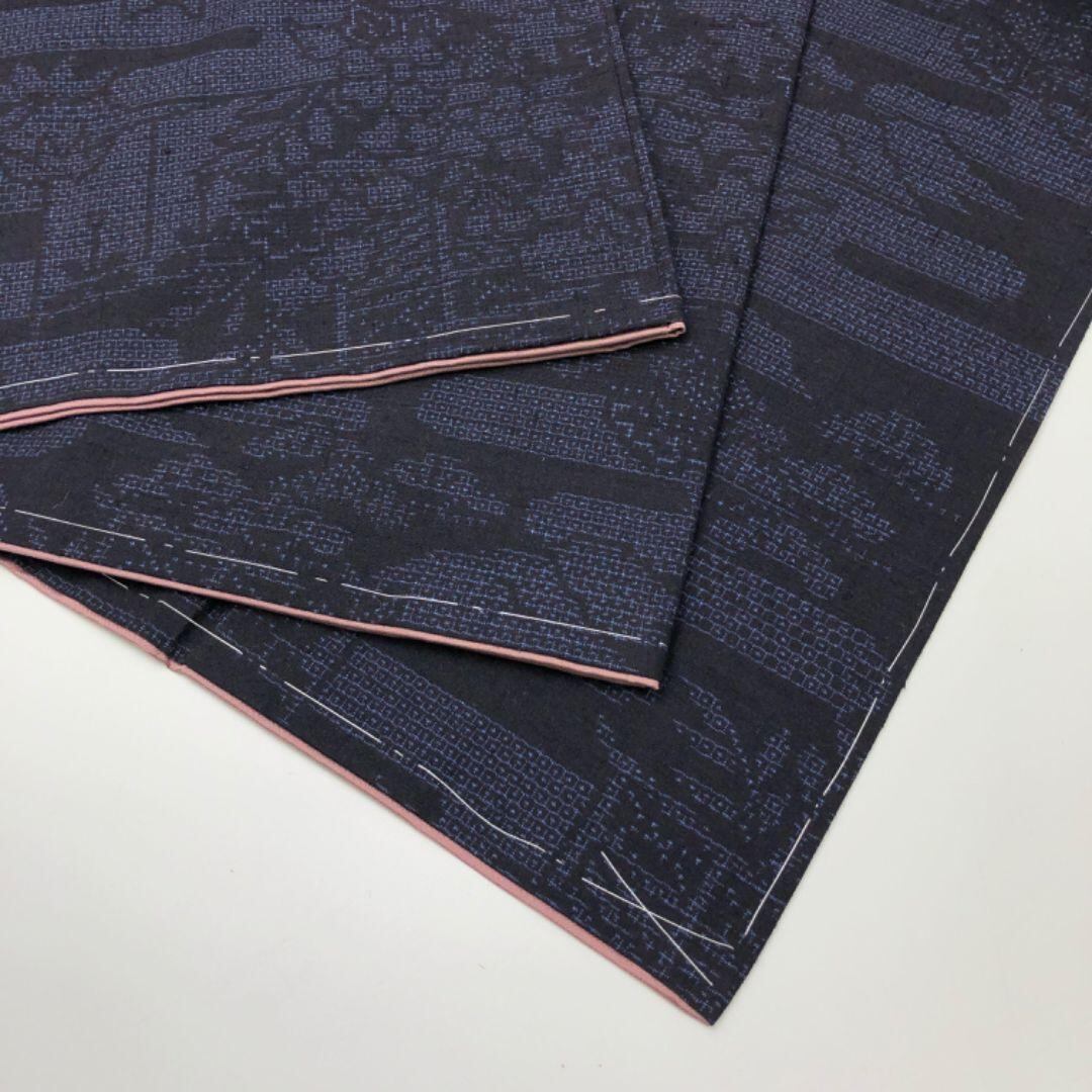 結城紬 100亀甲 エ霞に花柄模様 濃藍色 しつけ糸 K-4653 着物 きもの kimono 和服 和装 中古 リサイクル着物 【送料無料】