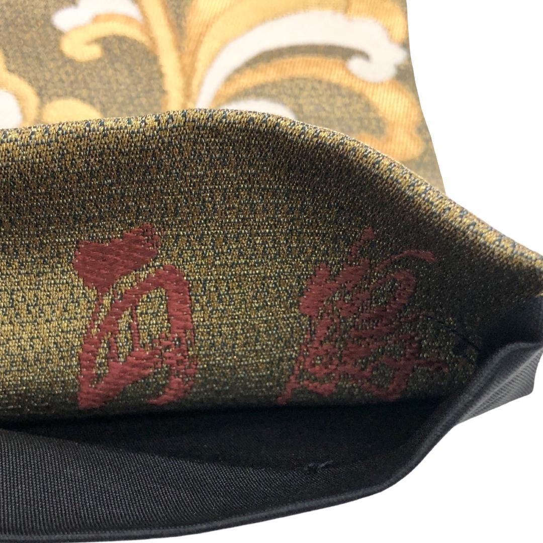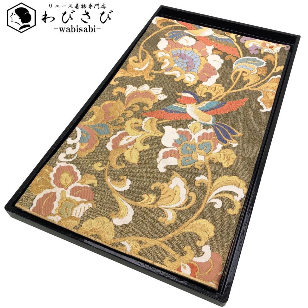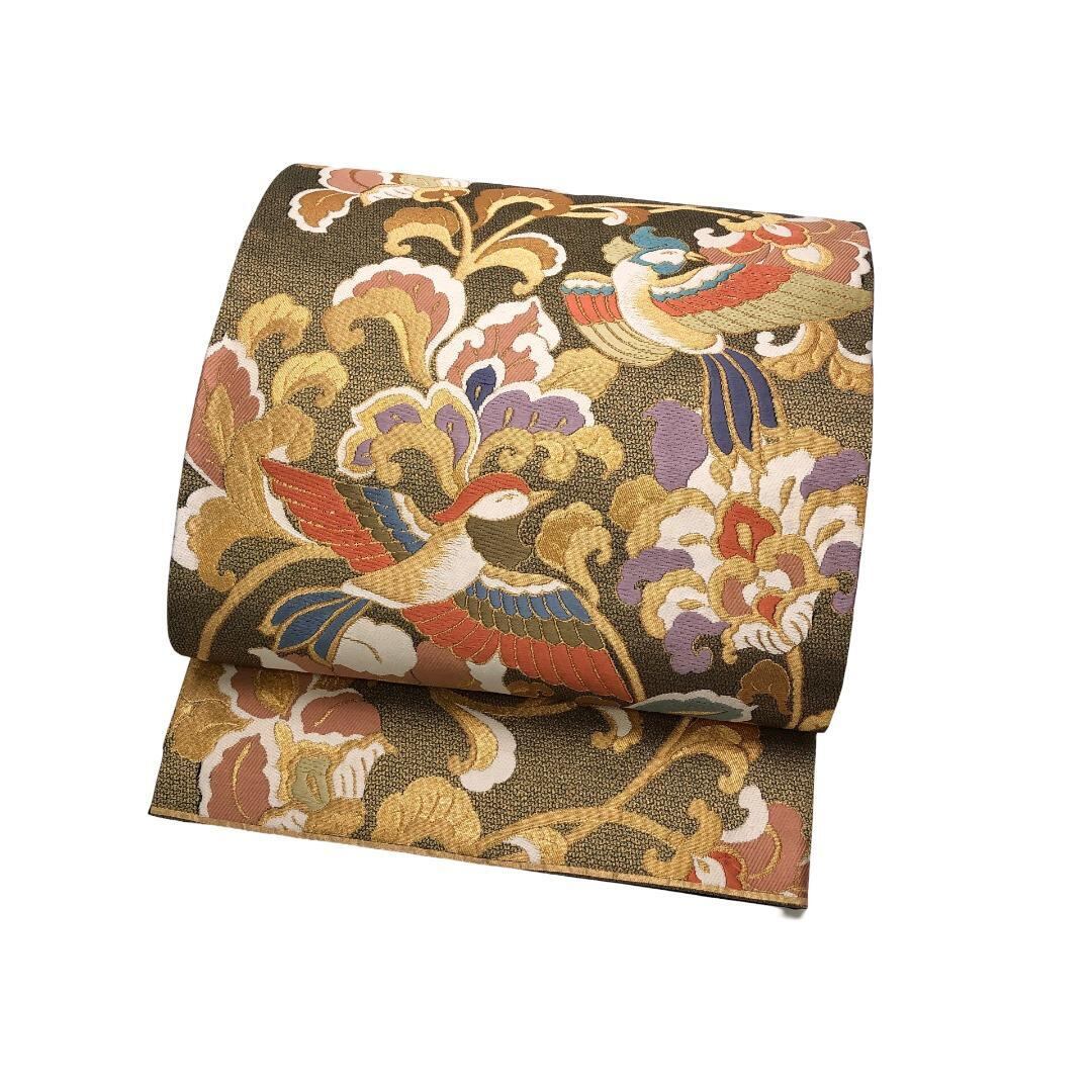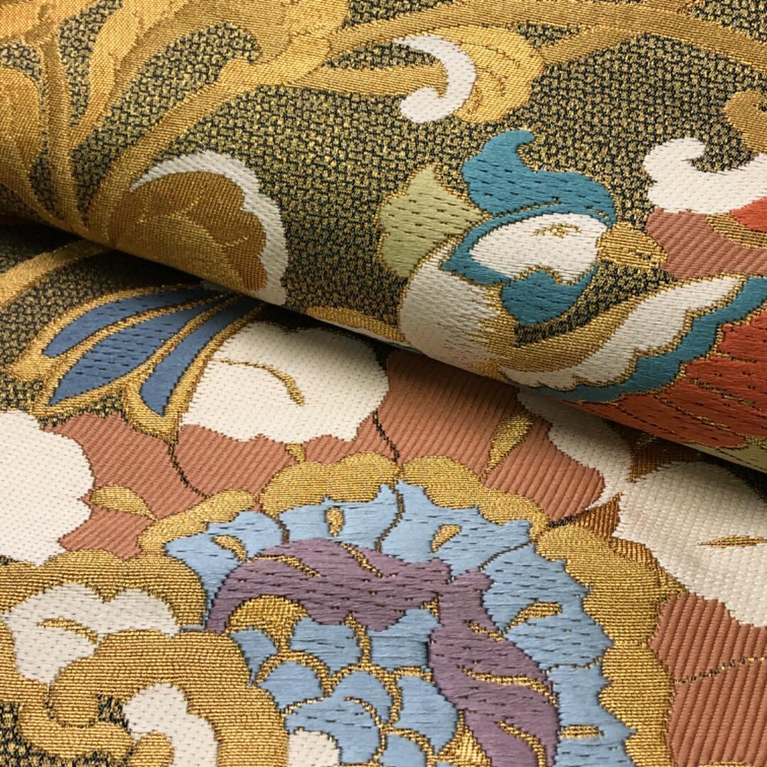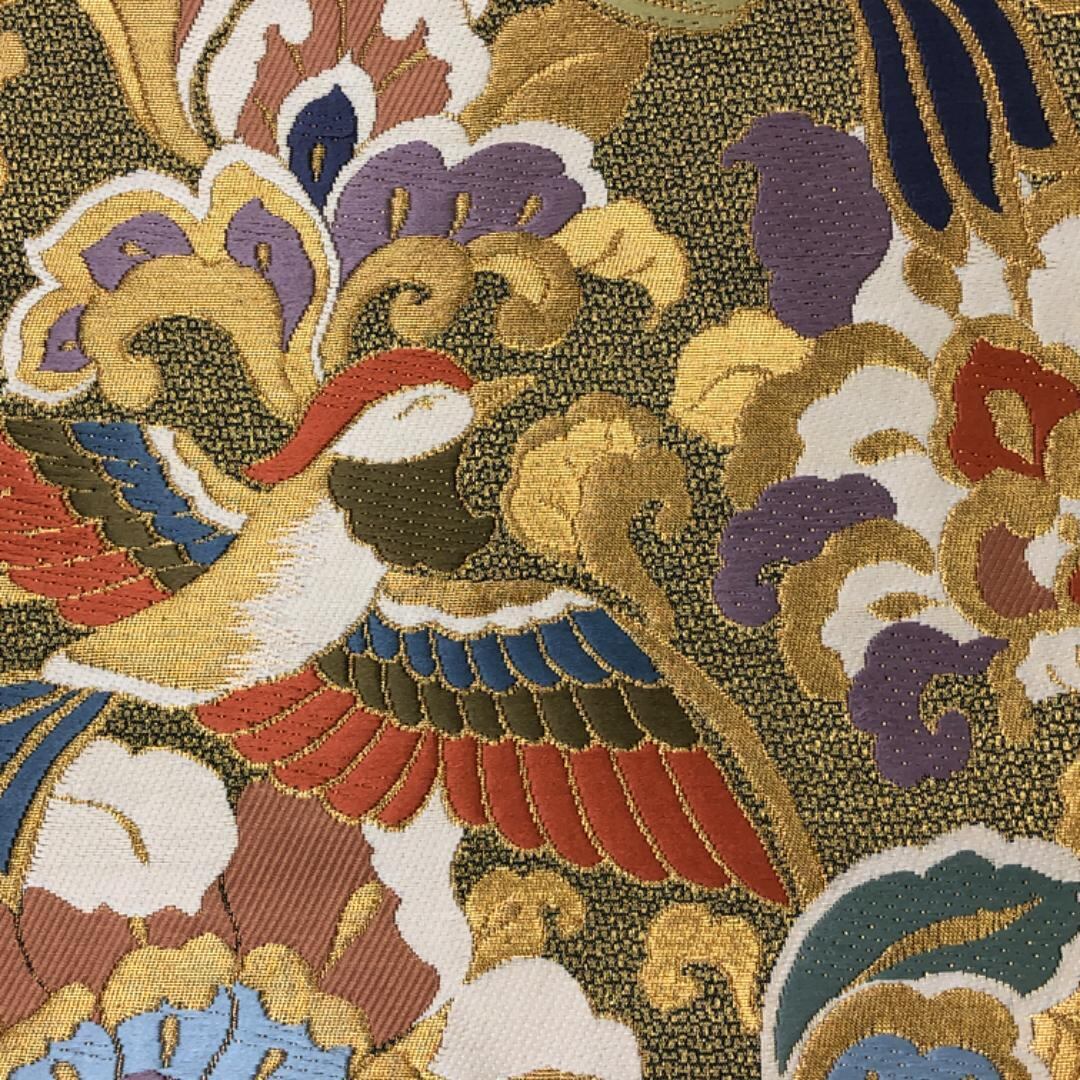 金色のベースのお色味に花唐草模様に花喰い鳥がデザインされた素敵な柄裄のお品でございます。