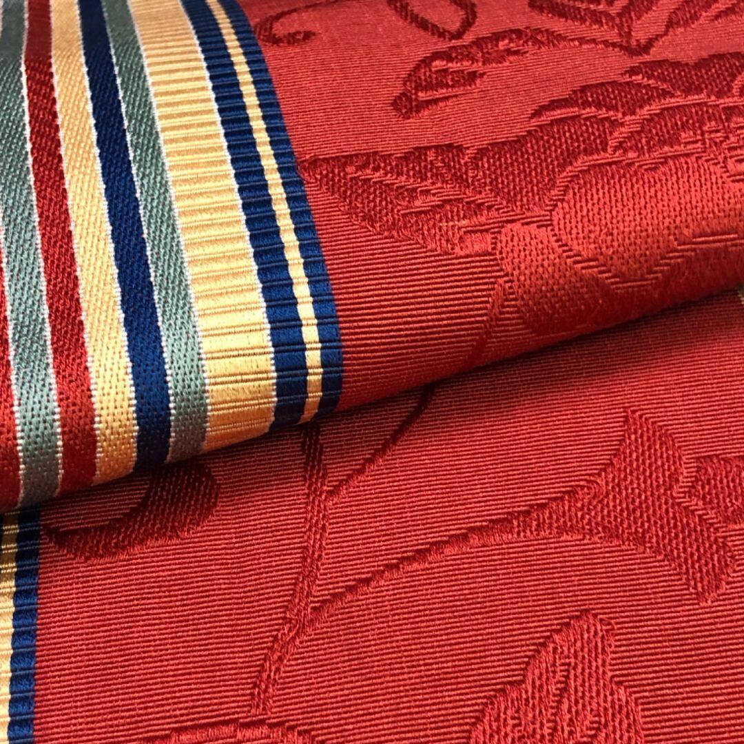 蘇芳色のお色味に縦縞に花柄模様がデザインされた素敵なお品でございます。